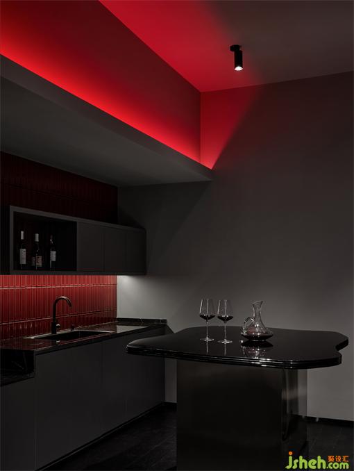 The middle island of the kitchen on the second floor is made of multiple layers of special-shaped gray wineglass.