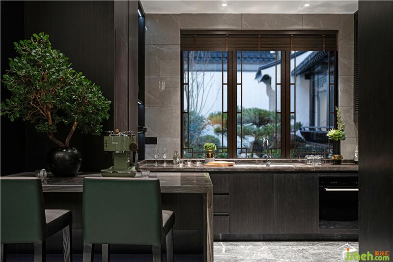 客廳中墨灰與星灰的深淺交織,加之古樸小品的點(diǎn)綴,鋪敘一室優(yōu)雅有度的氣韻。大面積的窗框亦是景框,將庭院的自然風(fēng)物引入視野之中,景與境相輔相成,宅院合一,意蘊(yùn)相生。