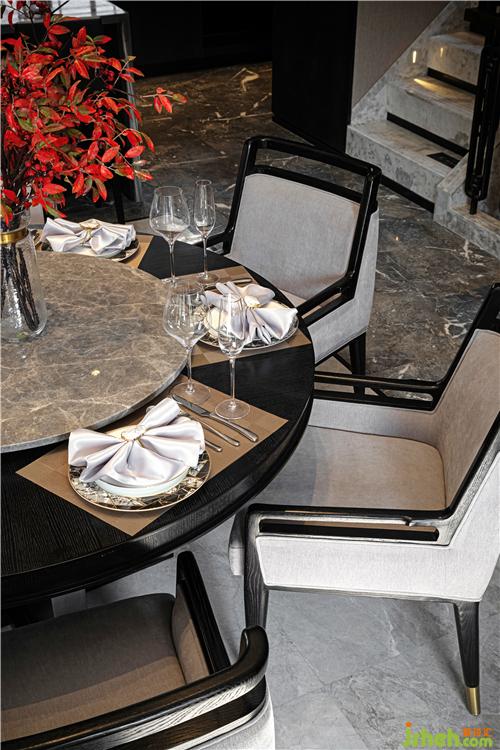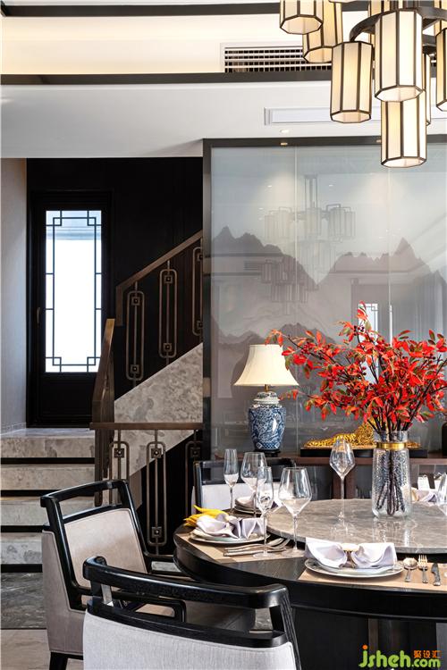 在設(shè)計(jì)師筆下,適應(yīng)當(dāng)下時(shí)代的東方美學(xué)是令空間與生活實(shí)現(xiàn)藝術(shù)化聯(lián)結(jié)的關(guān)鍵。一面墨跡山水的屏風(fēng),以徐徐展開的氤氳意境,鋪就餐廳的調(diào)性。古制燈籠在當(dāng)代線條的簡(jiǎn)化下,堆疊為一組藝術(shù)吊燈,與客廳燈飾遙相呼應(yīng),構(gòu)就對(duì)稱之美。