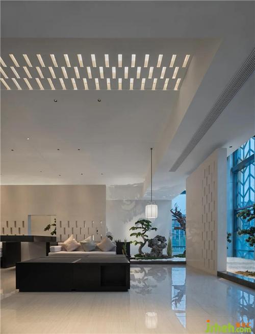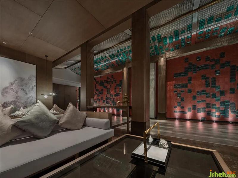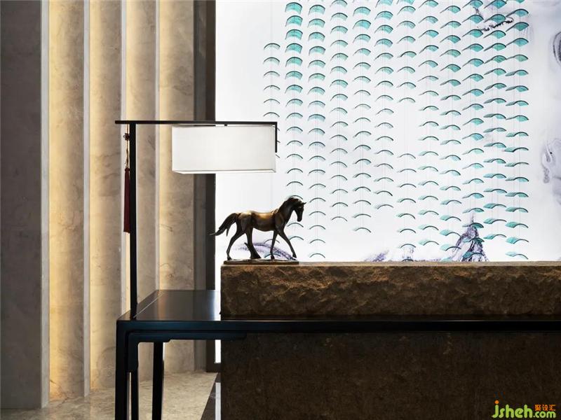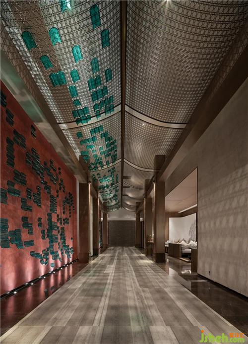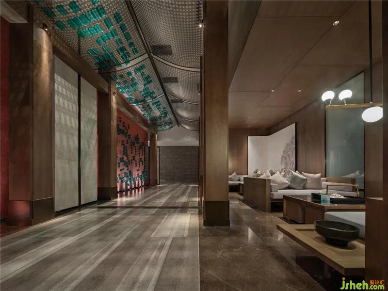設(shè)計(jì)師以濃墨重彩的力度來(lái)描繪過(guò)渡場(chǎng)域的東方氛圍,從用色到用材,從結(jié)構(gòu)到立意,延伸過(guò)道的縱深視覺(jué)感,實(shí)現(xiàn)煙波浩渺而意境悠悠的江南風(fēng)致。