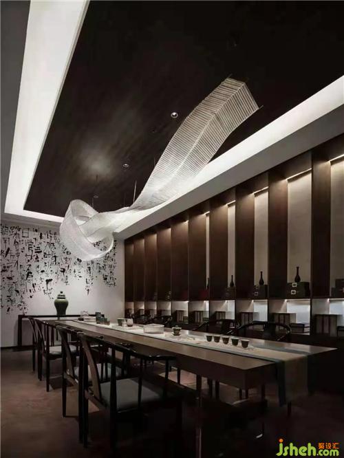 茶室以“雅”著稱(chēng),設(shè)計(jì)師通過(guò)樸拙的木藝長(zhǎng)案、狀似游云的飄逸燈飾、矯若游龍的書(shū)法墨跡,加之端雅小品的點(diǎn)綴蘇州餐廳設(shè)計(jì),令茶湯本身的清氣與茶藝這一傳統(tǒng)文化的韻味,在空間中鋪敘得淋漓盡致,整個(gè)茶室雅致有品而詩(shī)意沛然。