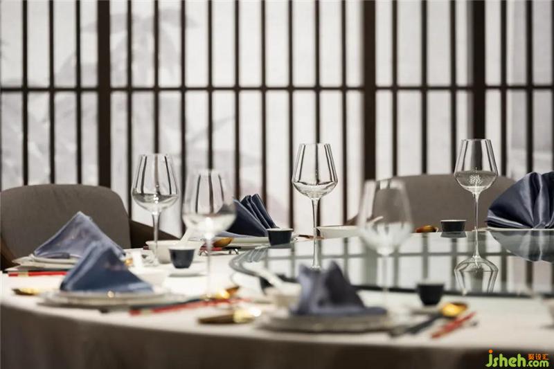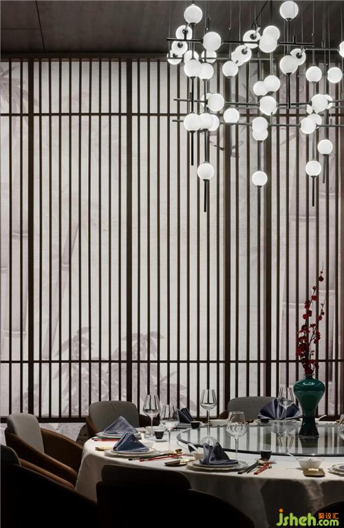 呂邵蒼設(shè)計(jì)骨子里探討的東方詩(shī)意,基于豐富靈動(dòng)的變化,而非一味循舊的傳統(tǒng)。在設(shè)計(jì)本案包廂時(shí),設(shè)計(jì)師賦予包廂“城市山林”的主題,以自然風(fēng)物與江南文蘊(yùn)為起筆,進(jìn)行場(chǎng)景美學(xué)的視覺(jué)化表達(dá),實(shí)現(xiàn)“不出城廓而獲山水之怡,身居鬧市而得林泉之趣”的理想情境。