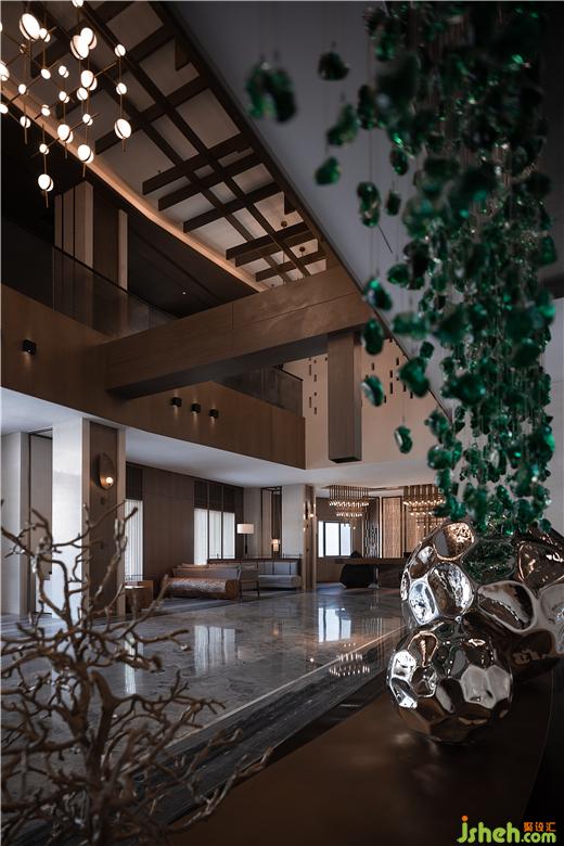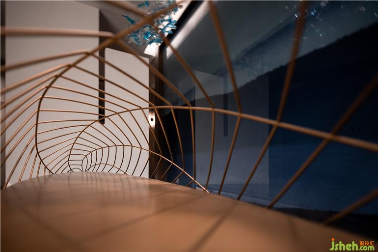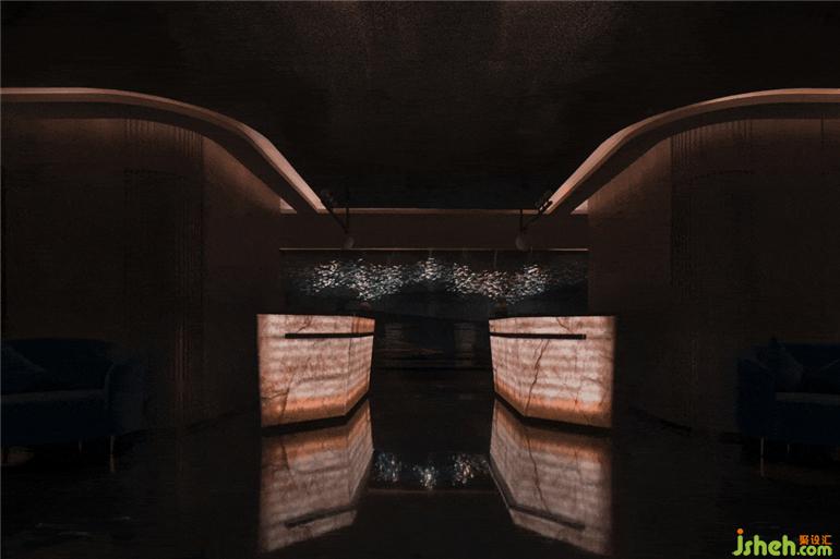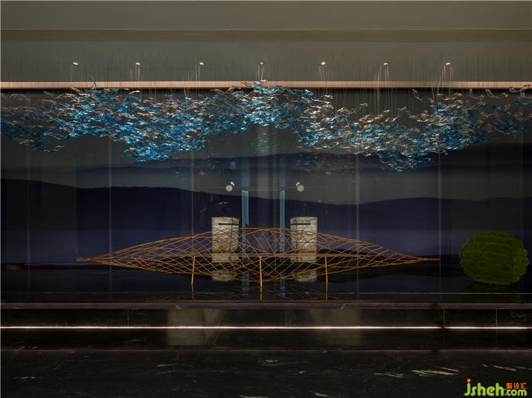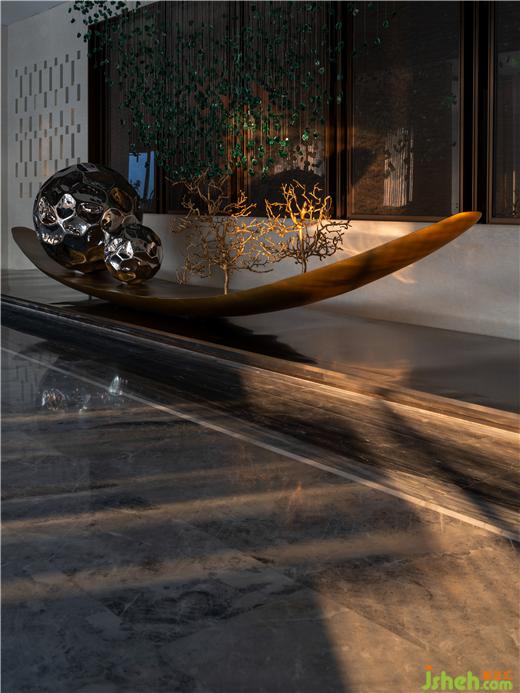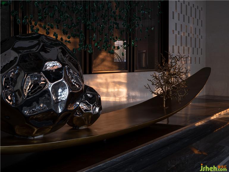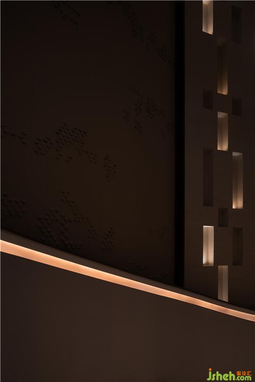 如乘船緩入,等候區(qū)域的走廊則更加深了江河暢流的觀感。兩側(cè)的燈帶似是河岸聳立,光影的投射中,悠長(zhǎng)而靜謐的河道徐徐向遠(yuǎn)。水療設(shè)計(jì)精巧鍍金鋼絲工藝的藝術(shù)裝置似扁舟一尾、又如落木一葉,在霧靄沉沉的山水背景里,隨漫天星霜而搖曳。