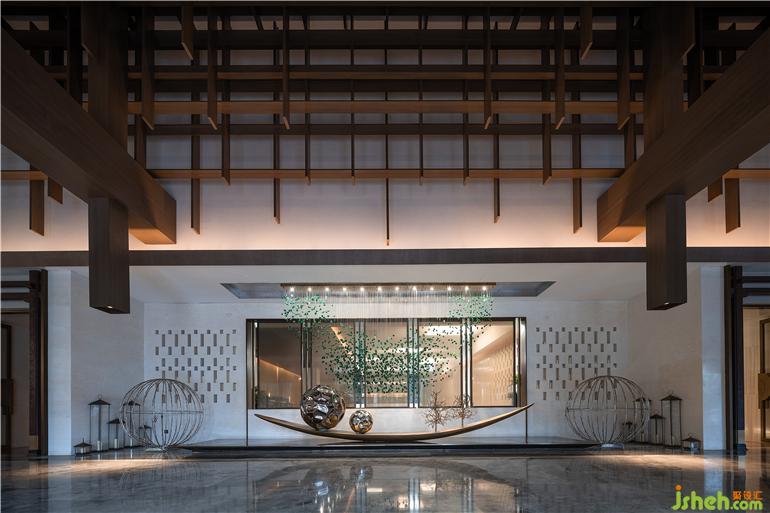 幸得泰興古城的和水風(fēng)光蔭庇,本案以富有當(dāng)?shù)刂鄞厣脑煨妥鳛槌跞腴T(mén)廳的主題設(shè)計(jì)方向。水療設(shè)計(jì)門(mén)廳的整體框架仿照了船艙內(nèi)的木質(zhì)結(jié)構(gòu)、以橫縱骨架為梁,迎賓處一楫悠然小船,搭配松枝、碧玉、水滴的自然元素,將自然氣韻融合現(xiàn)代的設(shè)計(jì)手法,勾勒出靜水深流的氛圍。
