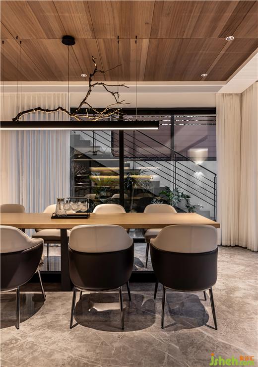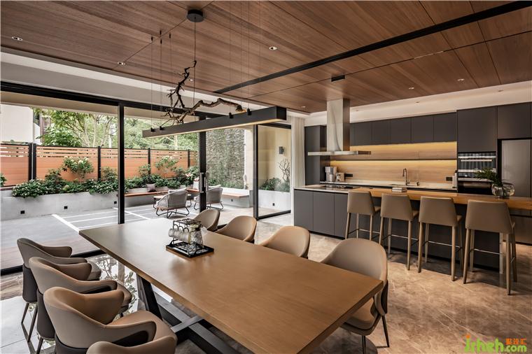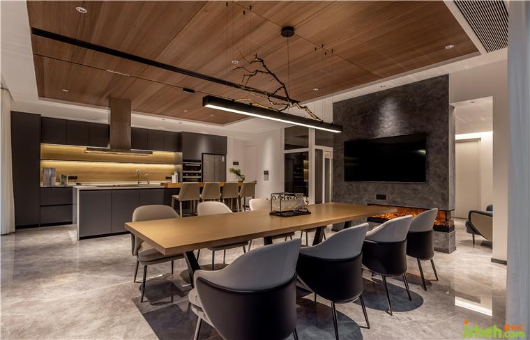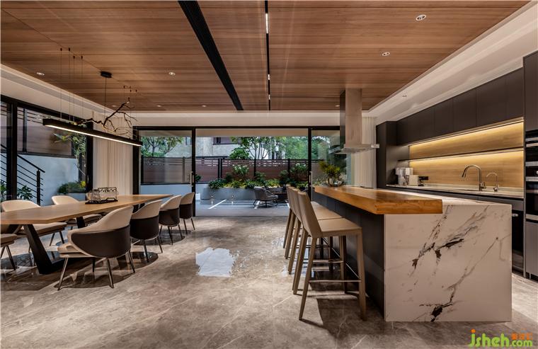負一層為主人接待友人和家庭娛樂的空間,開放式的西廚與用餐區(qū)形成很好的社交屬性,并穿插天花天然木紋的質(zhì)感表達,佛山保利云上別墅裝修設計讓餐廚空間自成一體,深淺色塊的碰撞讓空間不止是使用,而是另一種視覺的享受。