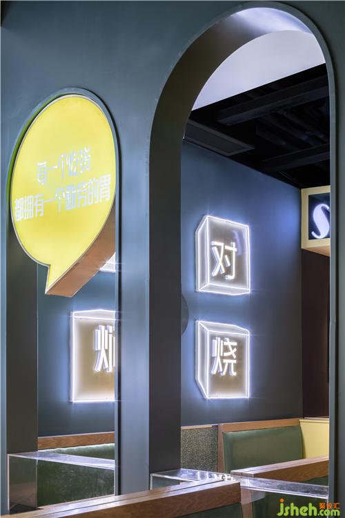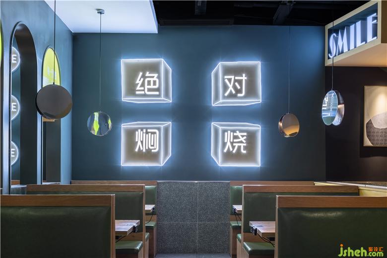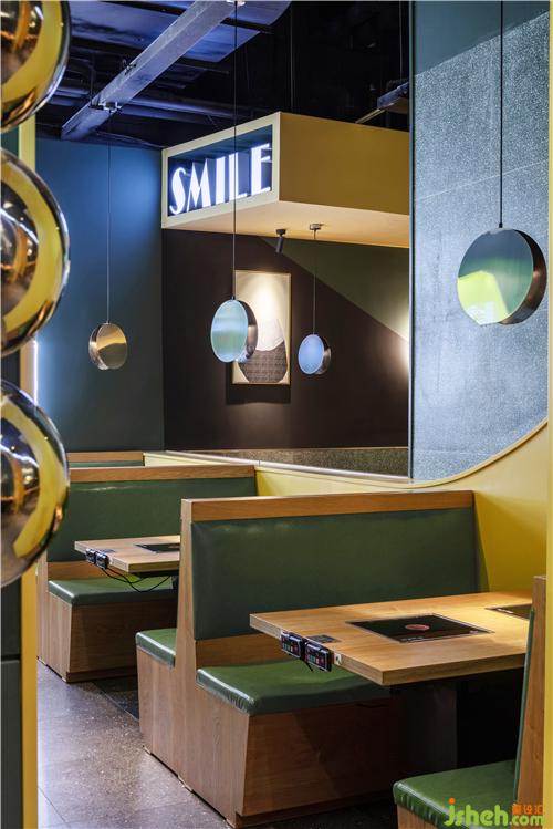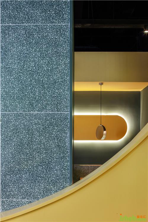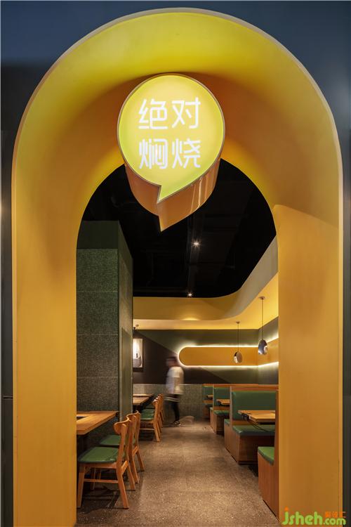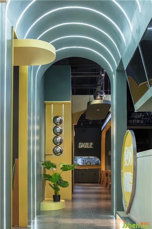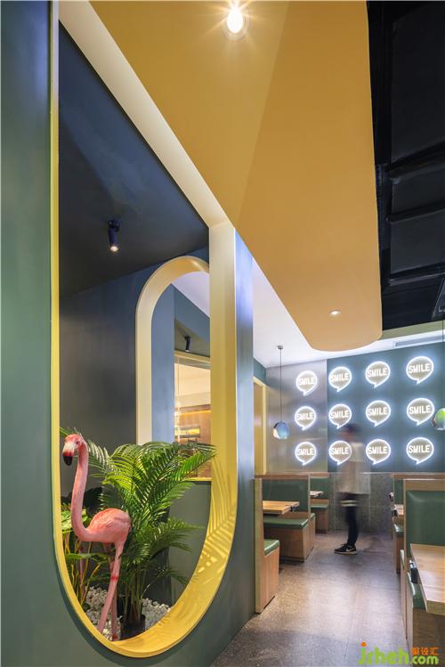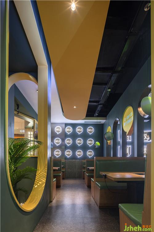 解構(gòu)主義的概念應(yīng)用貫穿了整個(gè)空間,室內(nèi)設(shè)計(jì)師通過(guò)一系列線條和幾何造型,創(chuàng)造出數(shù)個(gè)獨(dú)立但彼此連通的功能性空間。此外,將黃、綠作為主色調(diào),大面積的苔綠色所產(chǎn)生的靜謐感搭配跳躍的亮黃色的設(shè)計(jì),使黃、綠兩色充分碰撞并產(chǎn)生豐富的視覺(jué)沖擊力,突出了幾何圖形和不同色彩的混合,從而給予顧客充滿(mǎn)活力且輕松愉悅的用餐氛圍。