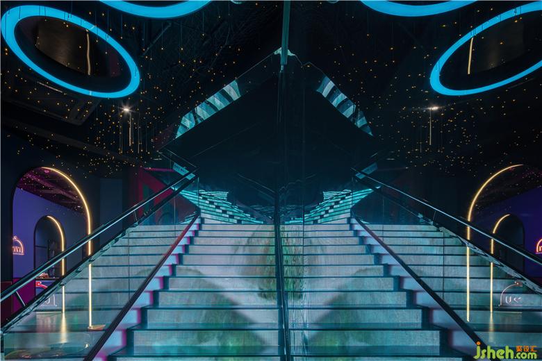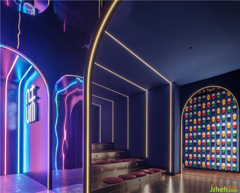 入口從品牌的機器人形象中提取出圓弧形元素,結(jié)合四周環(huán)繞的鏡面不銹鋼材料,帶給人們一種神秘跟未知感。彩色發(fā)光燈帶的運用,打造甜蜜歡樂的視覺感受的同時,呈現(xiàn)出場景的儀式感和迷幻感。