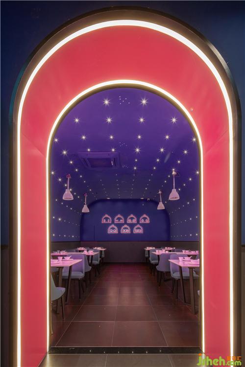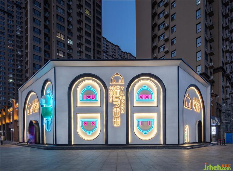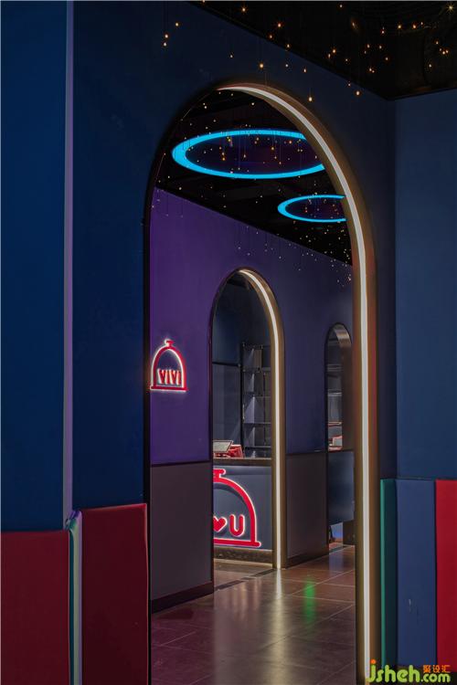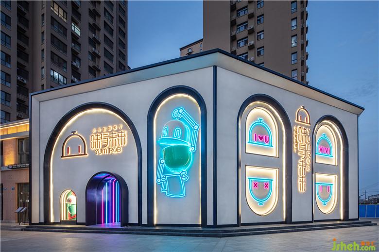 將抽象的品牌概念,轉(zhuǎn)化為可感知、可傳播的空間語言,并為商業(yè)經(jīng)營增加效益,是本案設(shè)計思考的核心。故而在門頭設(shè)計上,室內(nèi)設(shè)計師運用了極具建筑感的形象,在不同方位立體化地展現(xiàn)“味”與“未來”。大膽鮮明的色彩布置,讓餐廳設(shè)計成為街道靚麗而醒目的存在。VIVI的卡通化IP形象不僅可以作為賣點吸人眼球,還可以形成自己的視覺符號,增加品牌的辨識度。