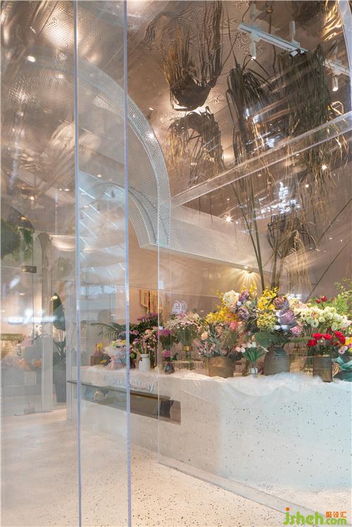 讓消費者容易識別和主動傳播是本案重點考慮的要素之一。室內(nèi)設(shè)計師在餐廳入口處設(shè)置了花藝櫥窗,通過鮮花的視覺沖擊形成品牌的記憶符號,吸引過往的顧客停住腳步的同時,也給進店消費的顧客留下深刻的印象。