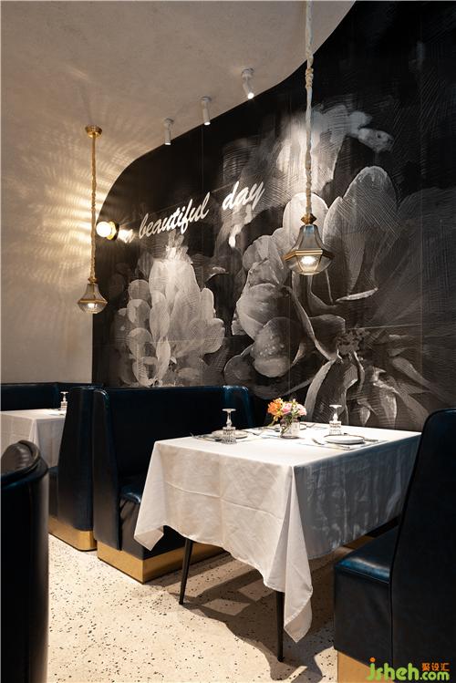 作為當(dāng)代藝術(shù)審美的表達,墻壁運用建筑的語言使空間更具力量與美感,描繪出高級且獨具特色的空間氛圍。黑白色調(diào)搭配金屬質(zhì)感的設(shè)計,奠定了沉靜的空間基調(diào)的同時,弱化了背景的渲染,讓人們通過材料的紋理,餐廳設(shè)計就能直接感受到品牌所傳達的真實和溫暖,為空間增加愉悅度和歸屬感。