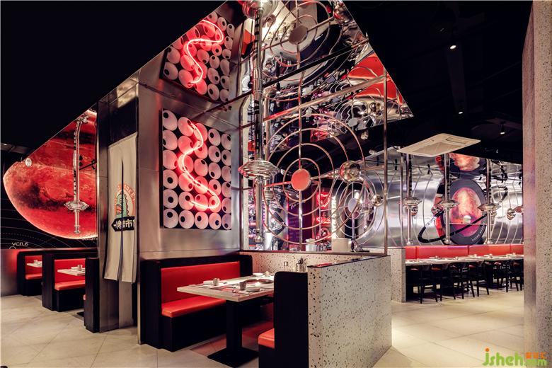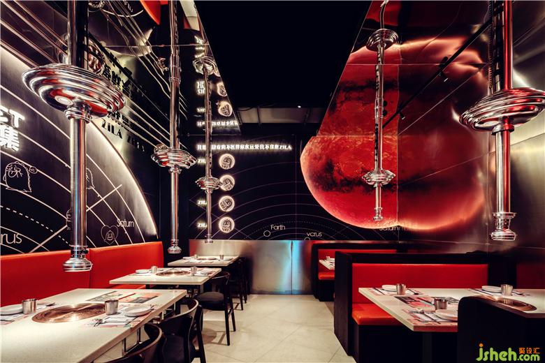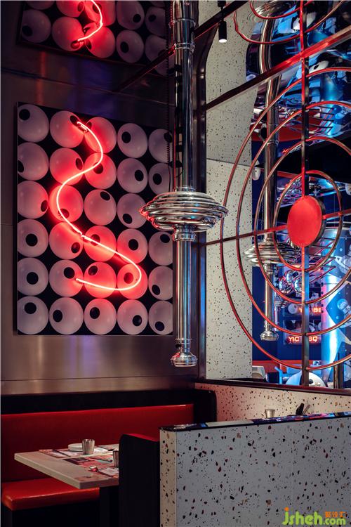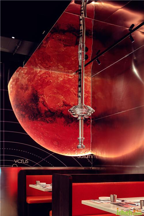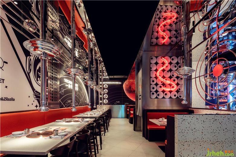 整個(gè)空間營(yíng)造出漫太空的感覺(jué),與整個(gè)品牌故事相呼應(yīng),設(shè)計(jì)師將ZILA獸延伸出來(lái)的其他插畫(huà)完美應(yīng)用在空間中。餐廳設(shè)計(jì)