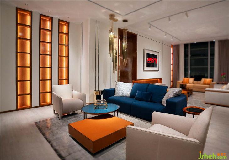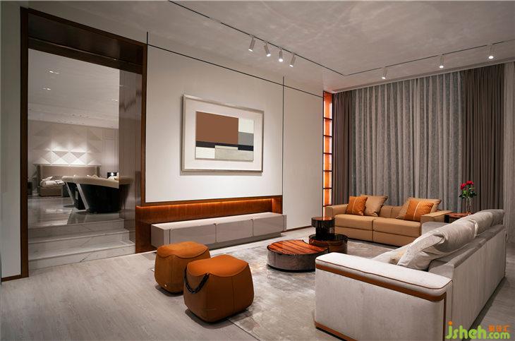 客廳主墻面是展廳過道的延續(xù)與結(jié)合,不著痕跡地形成一幅立體黃金比例分割的藝術(shù)品;雕塑感十足的木飾面藝術(shù)墻也因科技上乘的材質(zhì)、簡潔流暢的線條、和明而不媚的色彩,再一次刷新品牌慣有的審美,讓活力與溫馨并存。