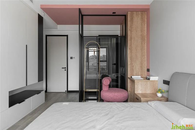 墻面采用木飾面與灰色乳膠漆拼接,頂面粉色色塊吊頂,和粉紅色的小座椅相呼應,讓空間更有活力,學習桌和床頭柜的功能合為一體,高度在650mm,方便使用又美觀。
