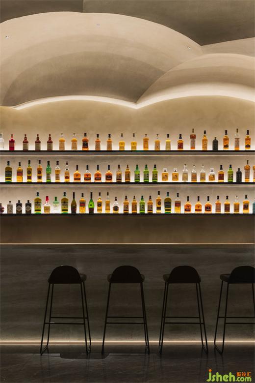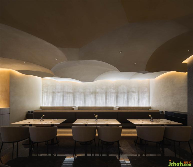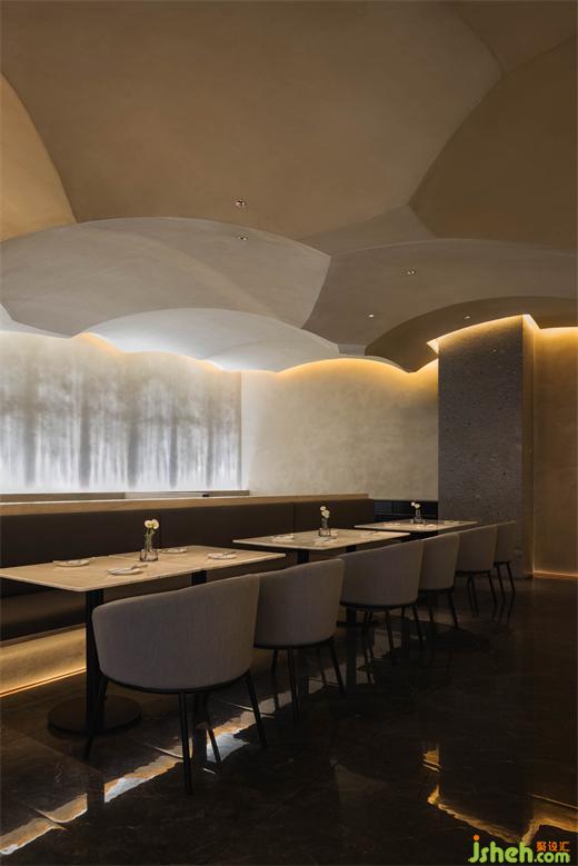 餐廳設(shè)計沿著墻面與地面交界處的“直線”線性燈帶,與沿著吊頂曲面布置的“曲線”線性燈帶交相呼應(yīng),共同烘托出墻面的燈光氛圍和極致的就餐體驗。