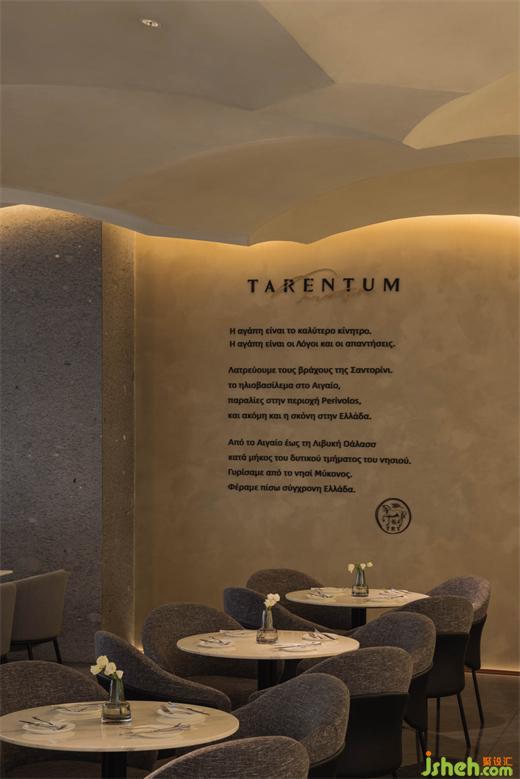 通往就餐區(qū)的走廊上有著等待人們發(fā)現(xiàn)的驚喜:餐廳設(shè)計走廊的起始端布置了放置雕塑的壁龕;走廊的盡端是希臘文撰寫的萄木文化墻。