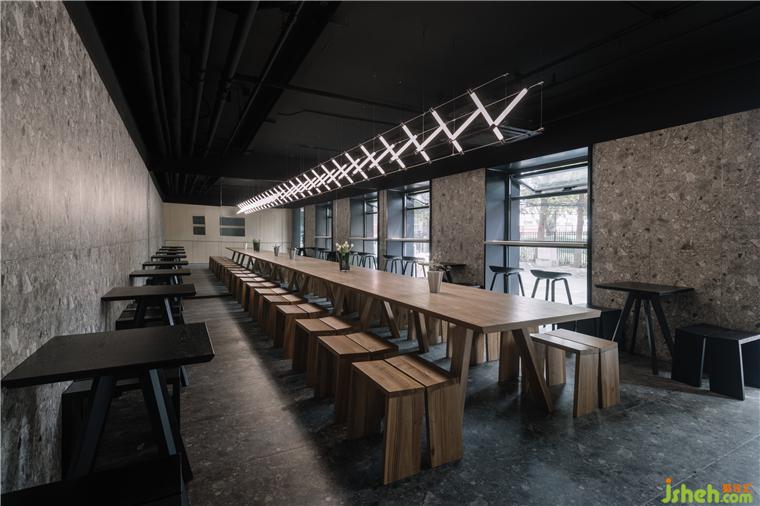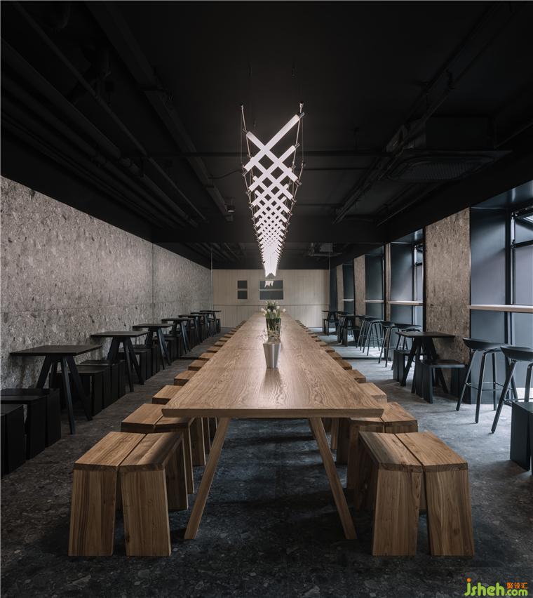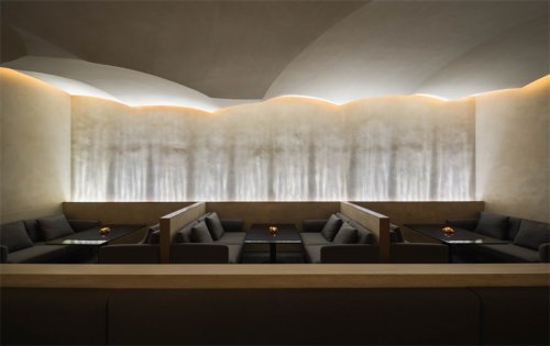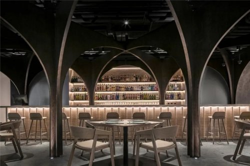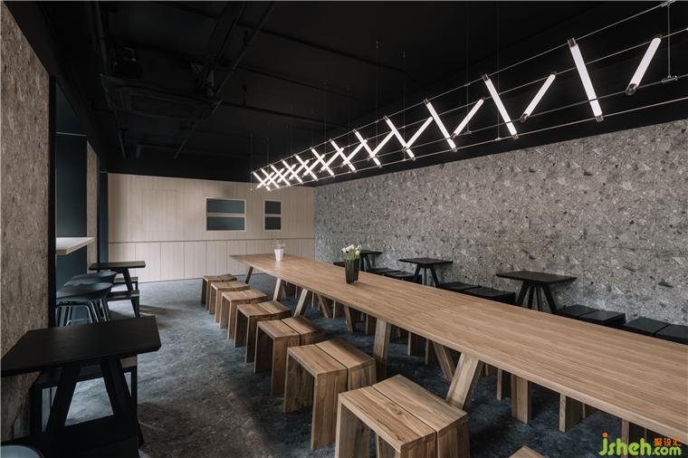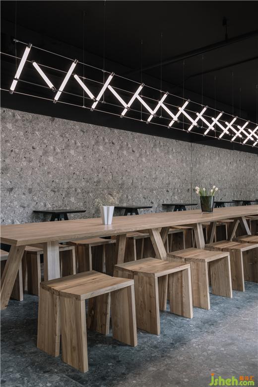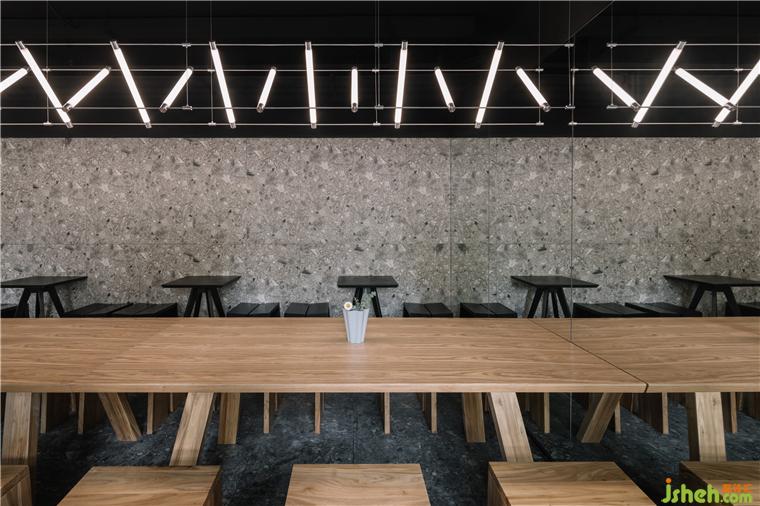 Inside, the design tossed the traditional complex decorative language. The terrazzo of the dark floor and light walls set off each other, and the metal Maza lights the unit frame echo the small wooden seats arranged in an array. One side of the interior is a monolithic mirror that mirrors the interior space and extends the journey of the space.