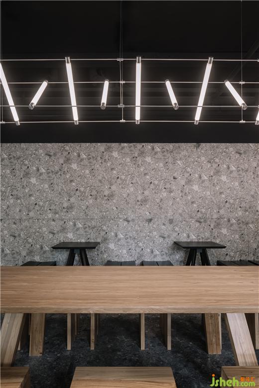 室內(nèi)環(huán)境為就餐的顧客提供了三種不同的空間選擇體驗(yàn):或坐在折疊窗邊擁抱充盈的煙火氣,或與三兩好友坐在長(zhǎng)桌下談笑風(fēng)生,餐廳設(shè)計(jì)亦或是依靠墻壁享受安逸的獨(dú)處時(shí)光?!袄锩妗钡那榫埃敲β档亩际腥诵断铝松畹拿婢?,脫下沉重的包袱,純粹而真摯的生活場(chǎng)景。