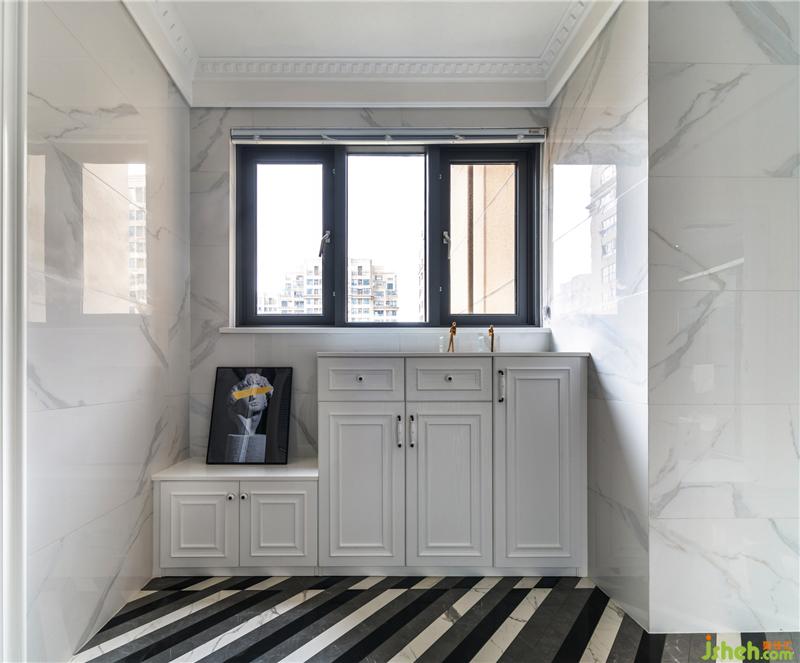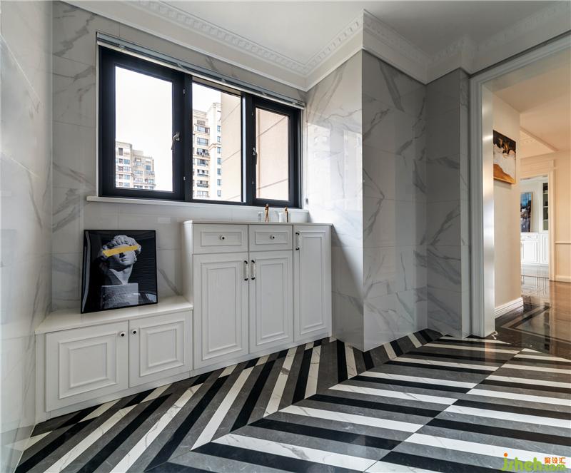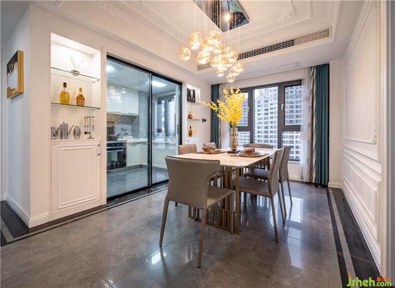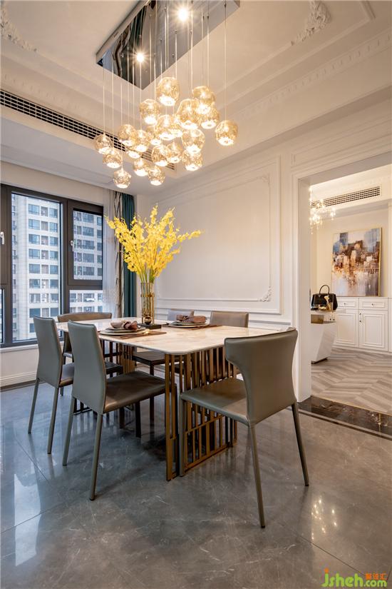餐廳不再需要傳統(tǒng)的邊吊和射燈,如夢幻泡沫般的玻璃藝術吊燈,一樣可以滿足空間照明,日落黃昏時的晚餐會更顯得有浪漫情調(diào),嫩灰色的餐椅、亮黃色的花卉。地面選用灰度太陽石系列瓷磚,搭配經(jīng)典黑大理石瓷磚走