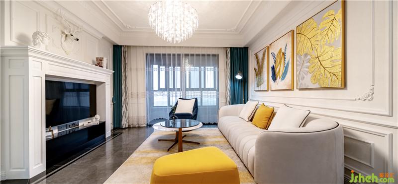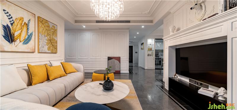 干凈優(yōu)雅的色彩基調(diào)搭配白色調(diào)的壁爐下與黑色電視機柜,顯得簡潔而雅致。深色的單人椅呼應著空間中的灰度,光線透過紗簾灑進室內(nèi),使得米色沙發(fā)顯得格外溫馨和舒適。