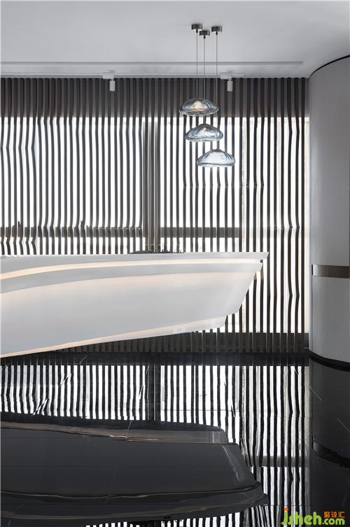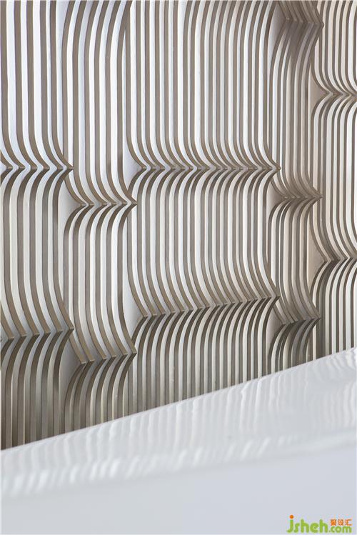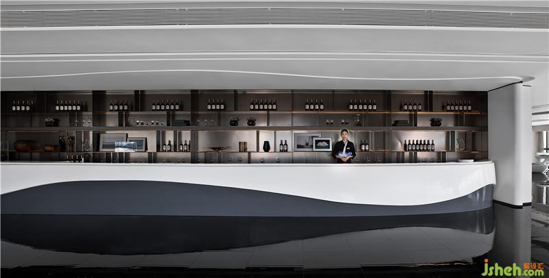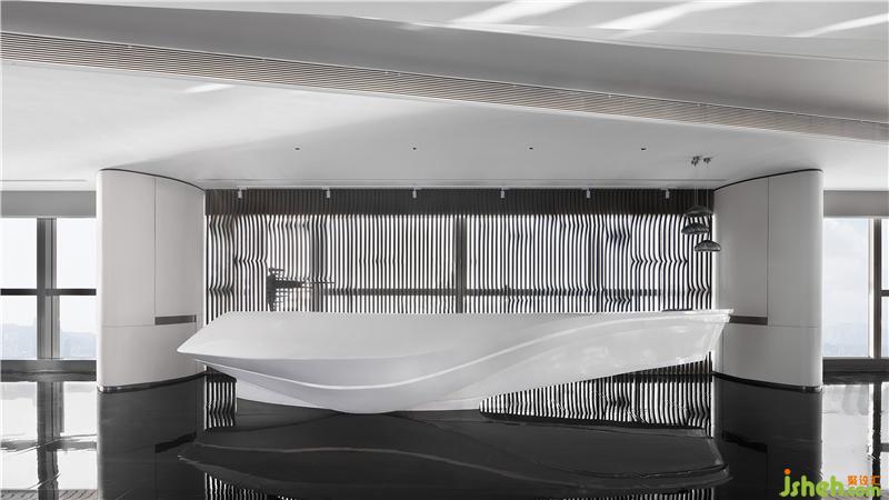 前廳的構(gòu)思秉承「少即是多」的建筑設(shè)計哲學。接待臺面模擬出海面波動的自然紋理,背景以海浪形意的柵格融入空間,與戶外的海面景觀內(nèi)外映合,虛實之間構(gòu)筑出空間的靈動感,空間通過設(shè)計相諧共生,達到彼此依賴的狀態(tài)。