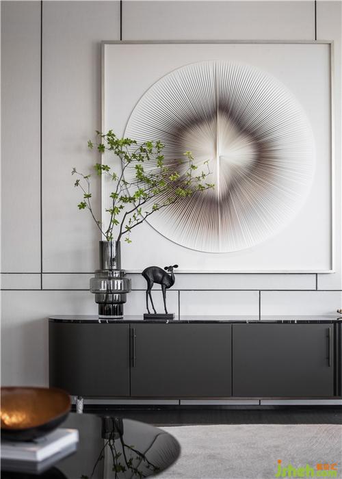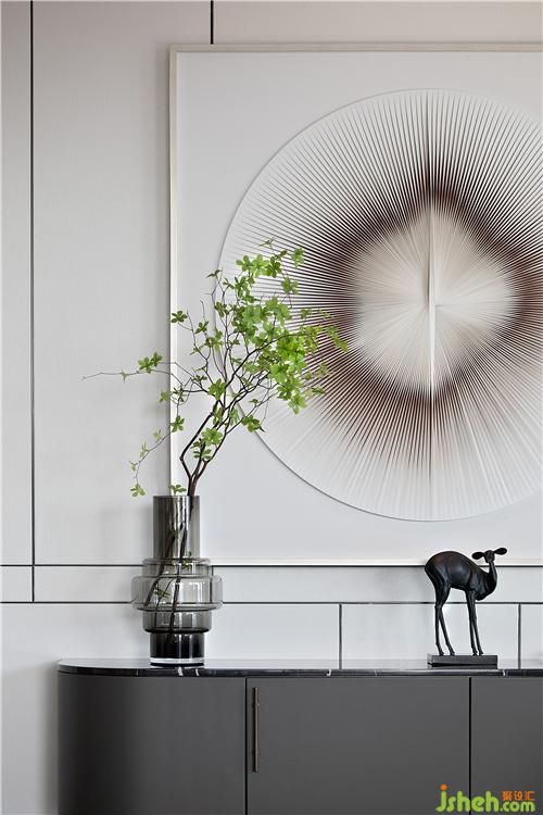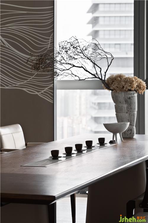 與室外景色相融的茶室一角,在保留茶文化本源的基礎(chǔ)上“不剝離其韻”,采用現(xiàn)代設(shè)計手法,摒棄多余的矯飾。闊景寬窗,以光滌塵,和諧共生。一杯茶、一本書,晨沐朝霞,夜觀星斗,咫尺乾坤盡在眼前。