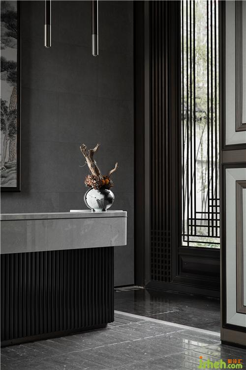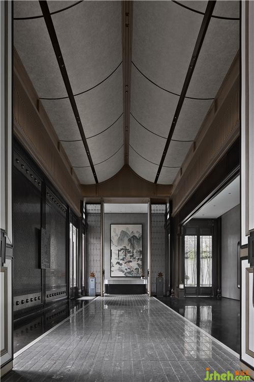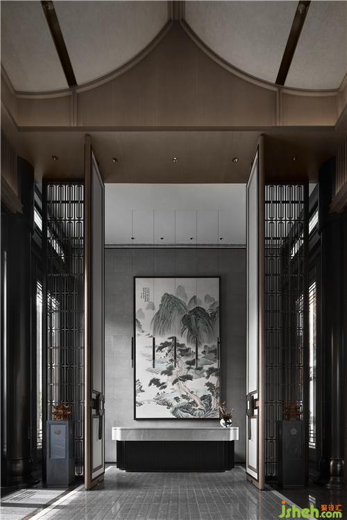 門廳承襲中式府邸的傳統(tǒng)對稱性布局,再現(xiàn)威儀大氣的禮序空間。人字形天花以傳統(tǒng)建筑結(jié)構(gòu)為原型,傳承千年建筑儀范,恢弘成勢,更賦予了空間雍容端莊的氣質(zhì)。