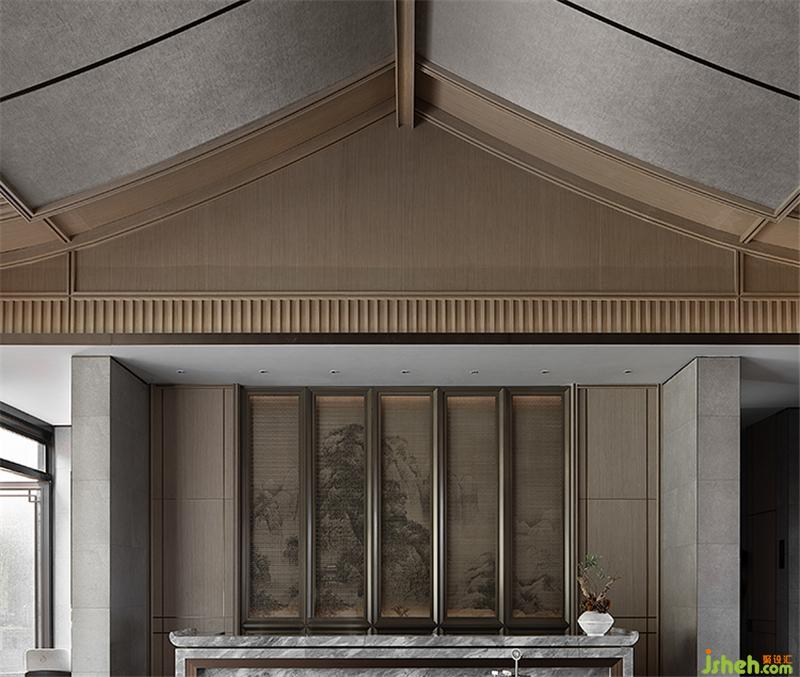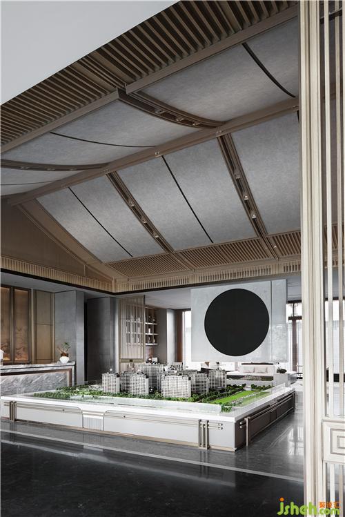 沙盤(pán)區(qū)上方采用中國(guó)傳統(tǒng)的坡屋頂元素,用現(xiàn)代手法進(jìn)行重構(gòu),展現(xiàn)了傳統(tǒng)與現(xiàn)代設(shè)計(jì)的共鳴。透過(guò)木色線條格柵,材質(zhì)與光影的動(dòng)態(tài)產(chǎn)生交互,凝結(jié)出畫(huà)面的豐盈意境。