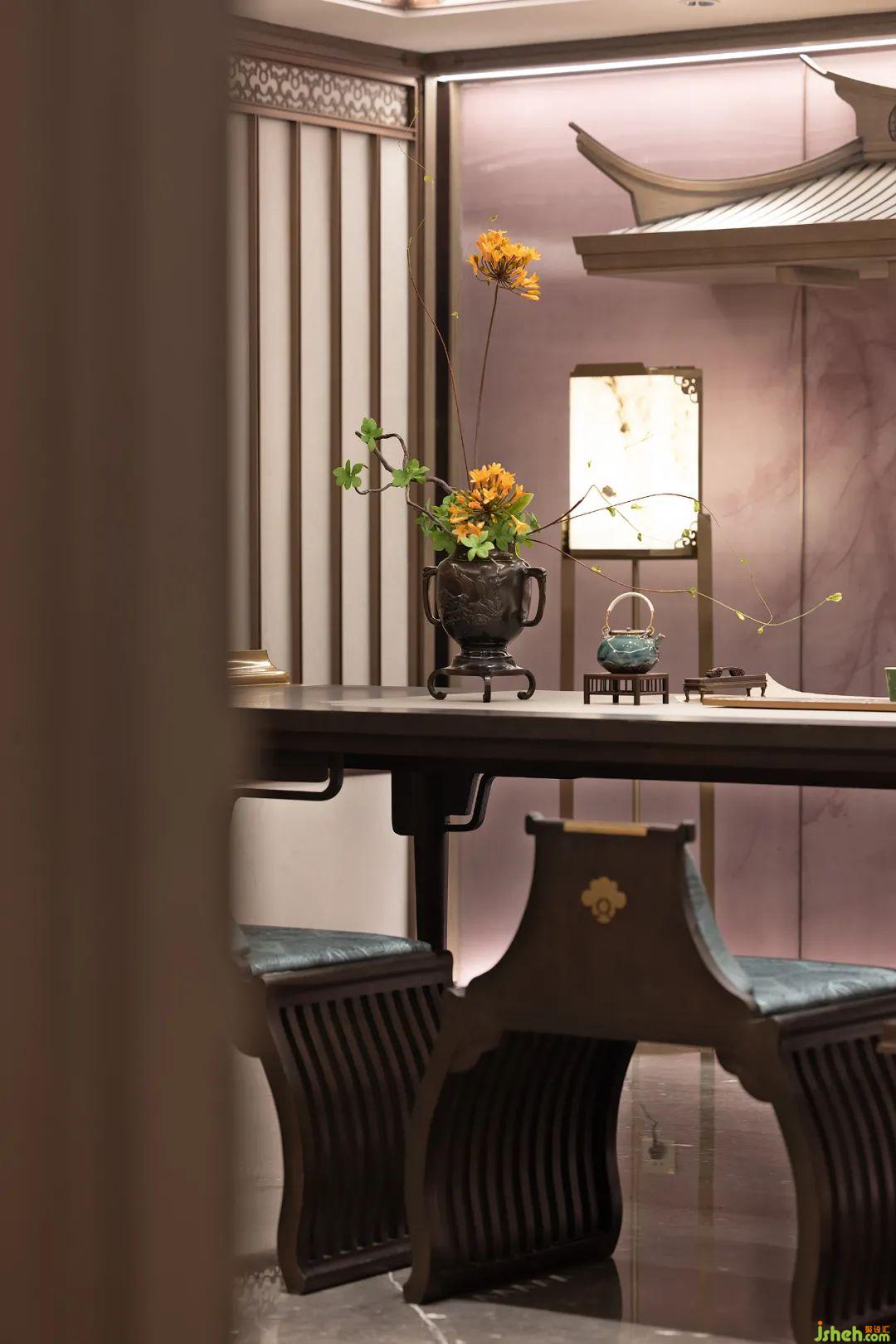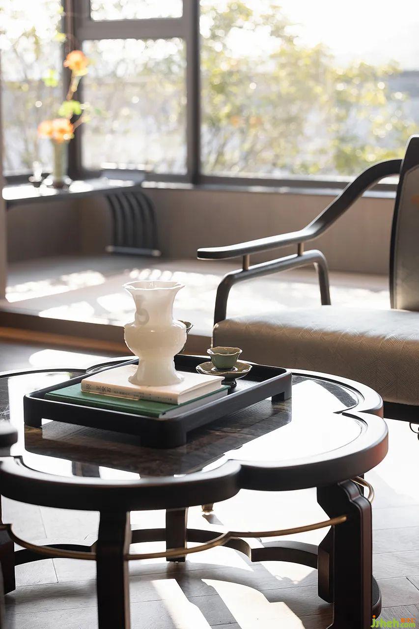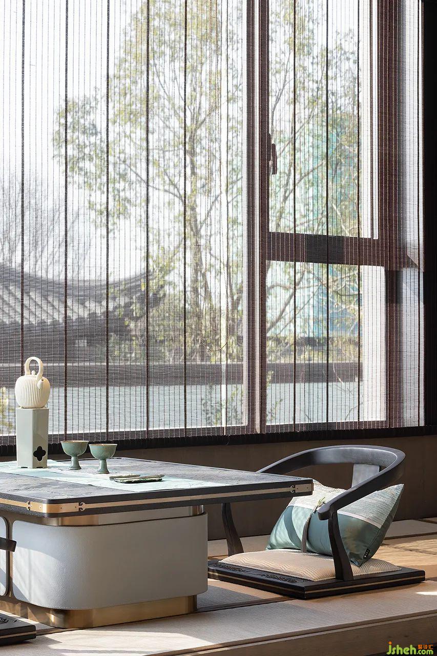在空間本質(zhì)美的構(gòu)建上,主臥延續(xù)整體設(shè)計(jì)基調(diào),墻面定制的山水背景鋪陳出靜謐的美感。室內(nèi)置入茗茶區(qū),對(duì)于居者的審美與喜好而言,空間的整體視覺風(fēng)格和功能體驗(yàn)都是優(yōu)雅的體現(xiàn)。闊景寬窗引景入室,以光滌塵,和諧共生。一杯茶、一本書,讓儀式感與觀賞性都一覽無(wú)余。