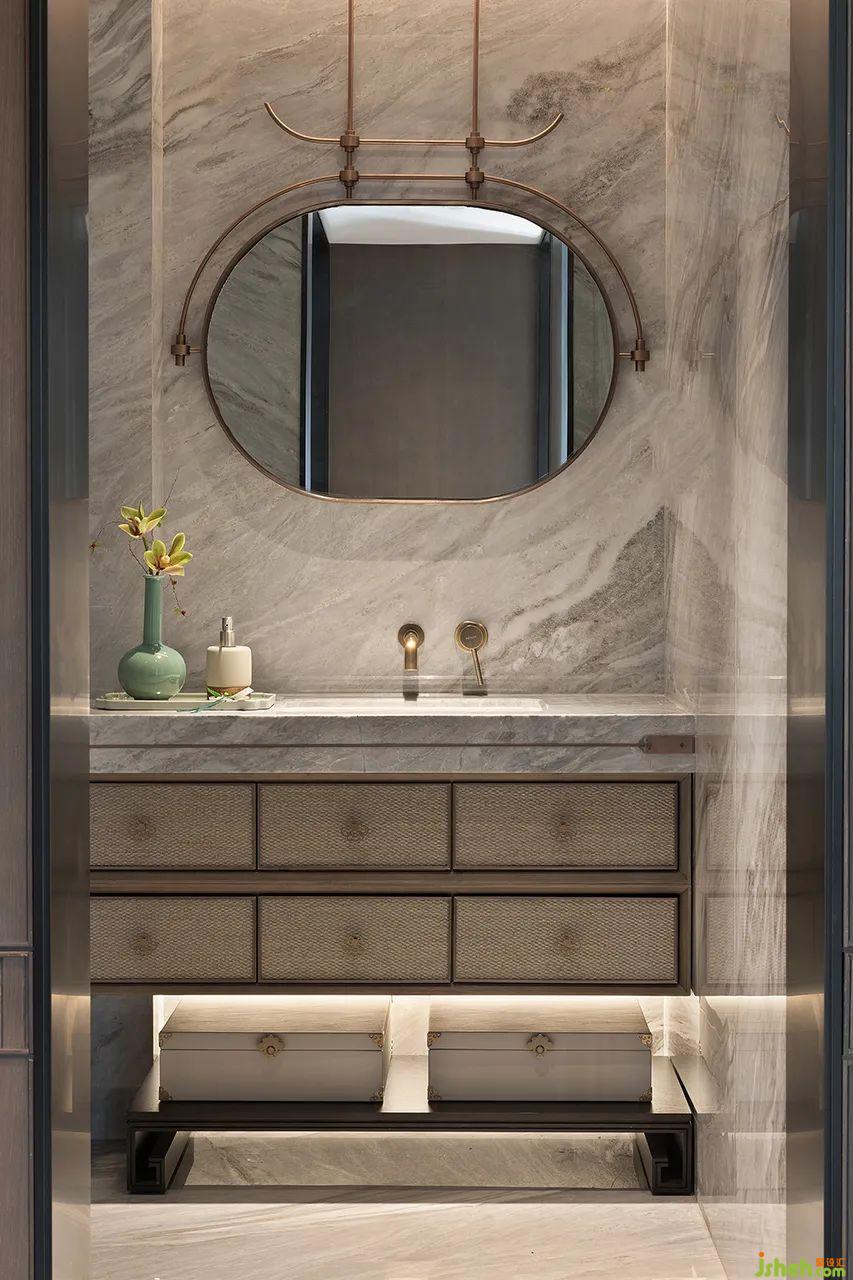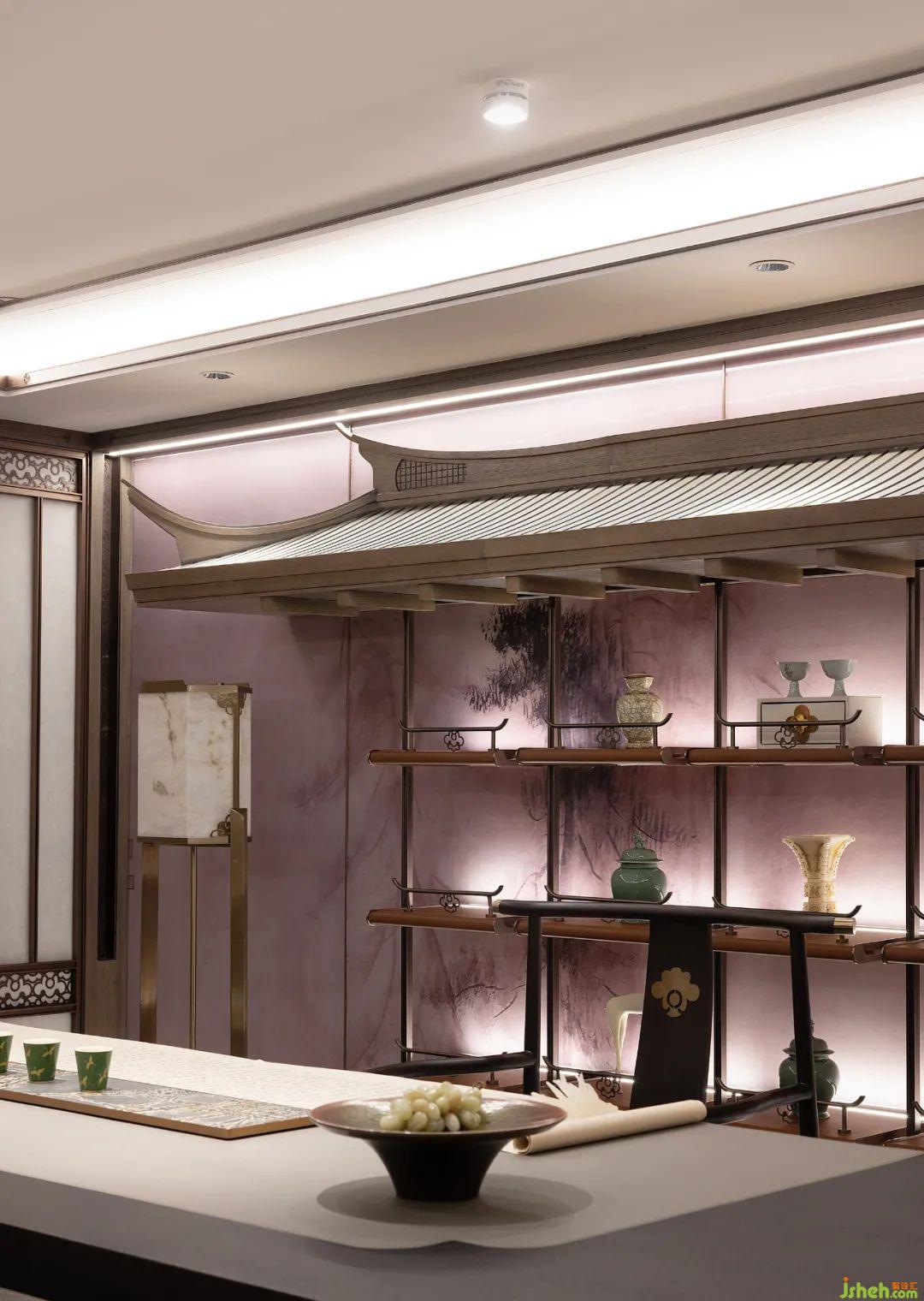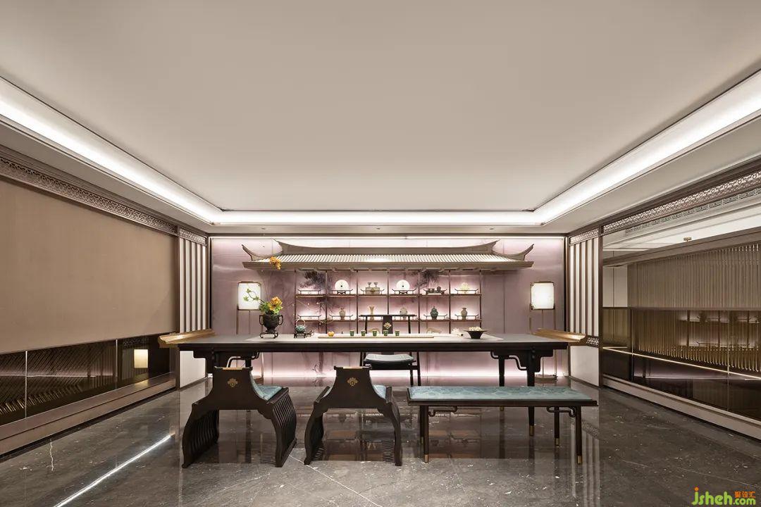 在空間本質(zhì)美的構(gòu)建上,主臥延續(xù)整體設(shè)計(jì)基調(diào),墻面定制的山水背景鋪陳出靜謐的美感。室內(nèi)置入茗茶區(qū),對(duì)于居者的審美與喜好而言,空間的整體視覺風(fēng)格和功能體驗(yàn)都是優(yōu)雅的體現(xiàn)。闊景寬窗引景入室,以光滌塵,和諧共生。一杯茶、一本書,讓儀式感與觀賞性都一覽無(wú)余。