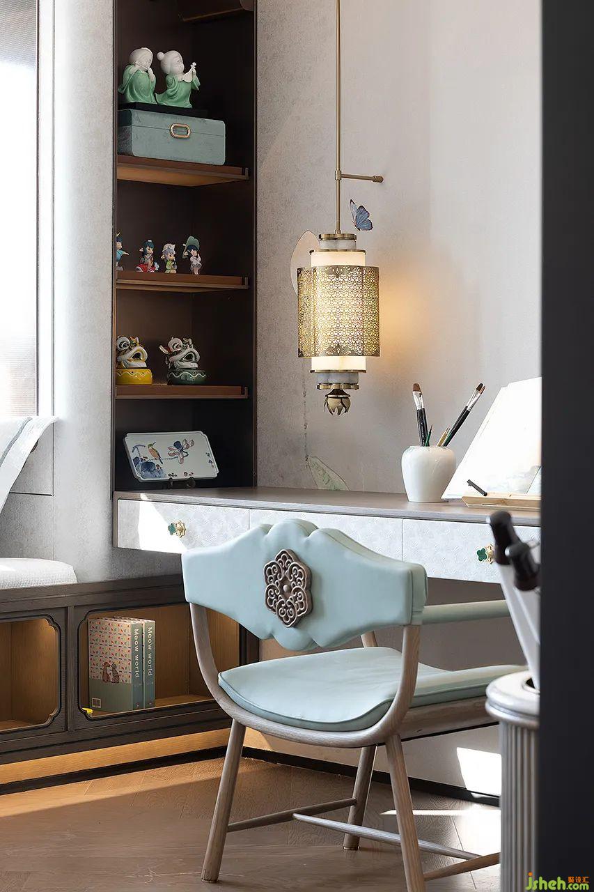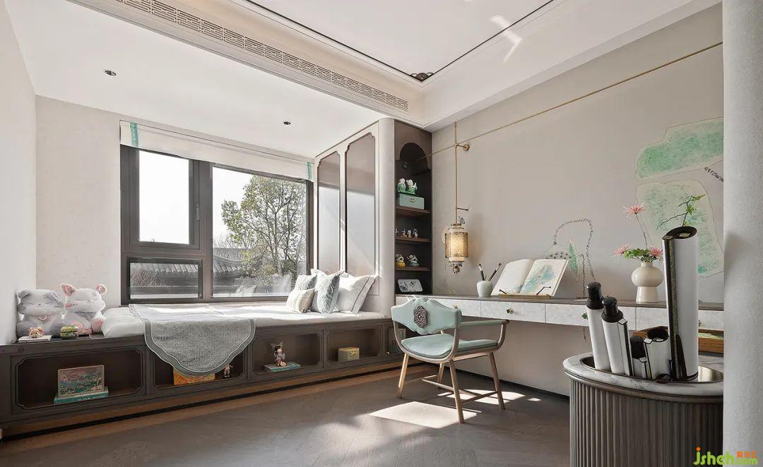 兒童房的設(shè)計(jì)采用中式淡雅為色調(diào)來(lái)營(yíng)造臥室的溫馨氛圍。窗外窗內(nèi)皆是景,月下花影,一墻氤氳淡然的花樹剪影,為孩子編織一簾幽夢(mèng)。