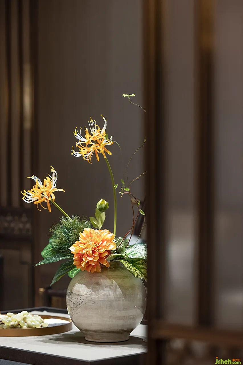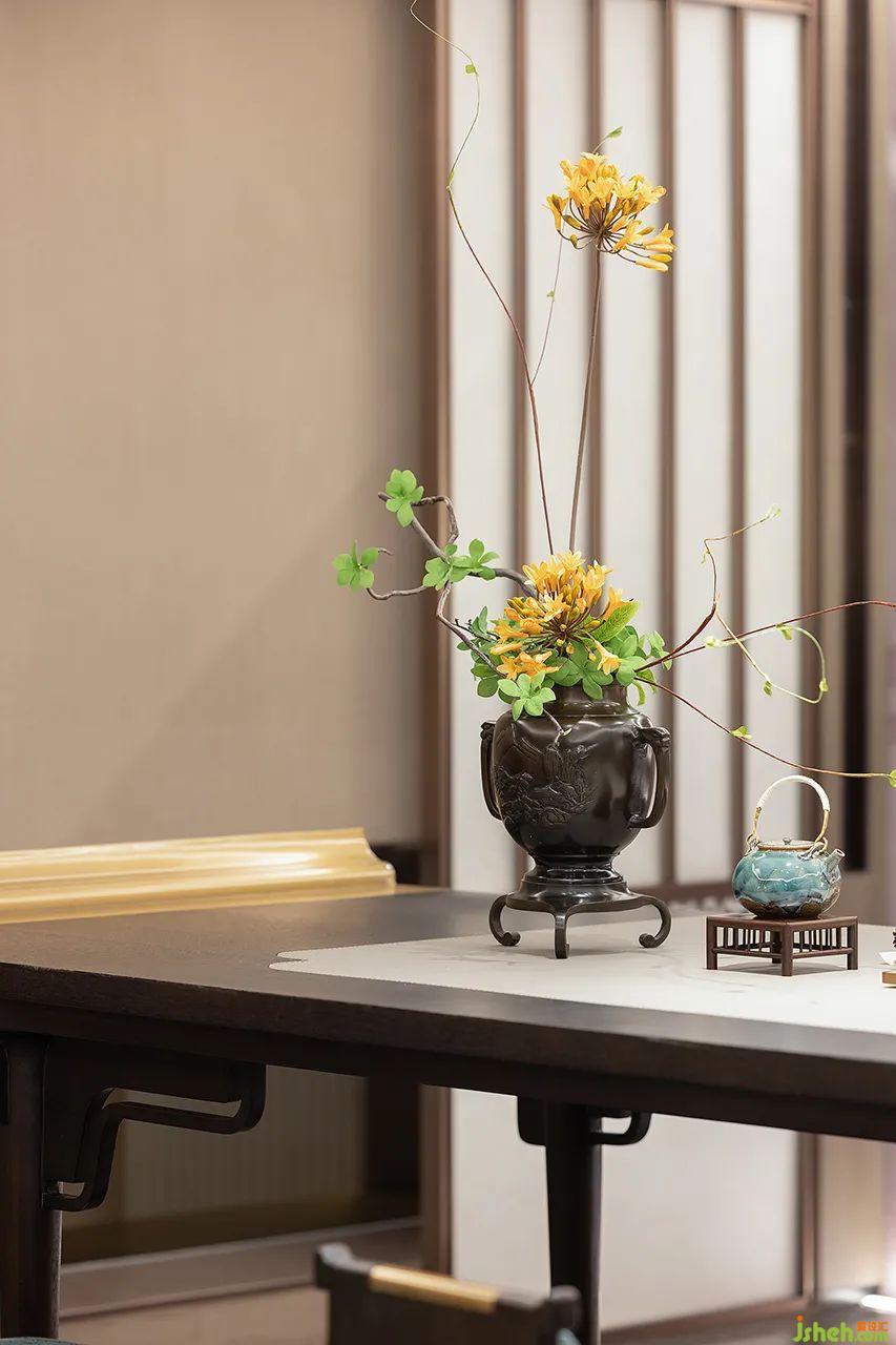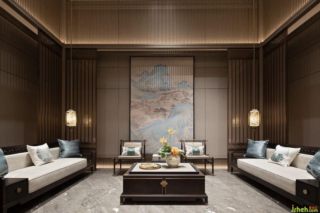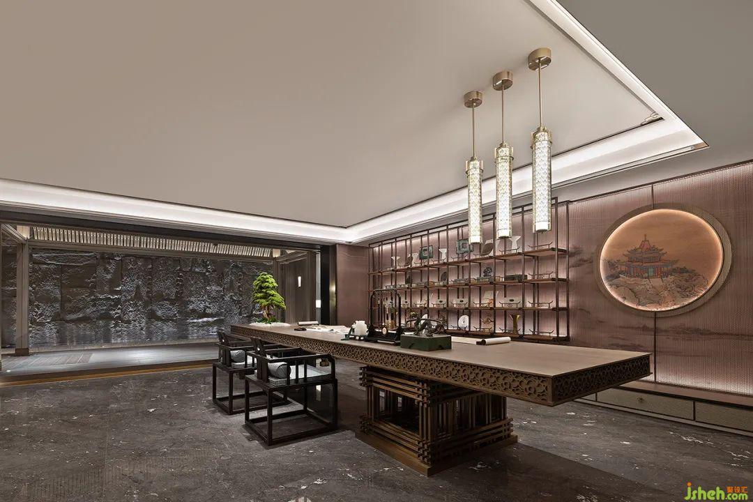 會客廳以格柵的形式包圍,為空間增添中式美學演繹,在這一隅屬于會客的場景里,簡潔有力的空間體量將視野不再拘泥在建筑的架構之中,讓情景與環(huán)境緊密縫合。