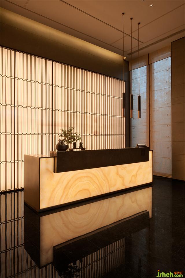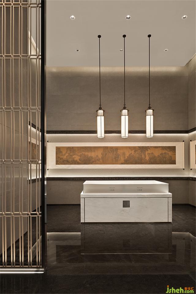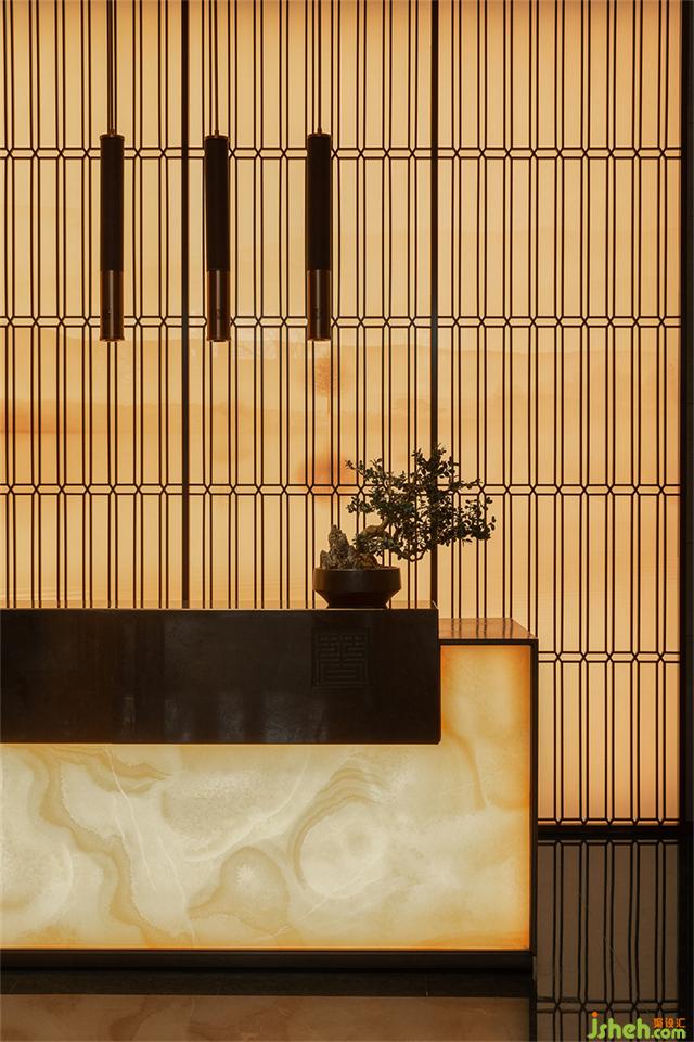 步入接待廳,格柵屏風(fēng)滲透出影綽的遠(yuǎn)山層疊與水紋肌理的臺(tái)面動(dòng)靜相襯,營(yíng)銷中心設(shè)計(jì)賦予流動(dòng)的語言,增添不同層次的感官體驗(yàn)。游走于空間線條之中,無限延伸、擴(kuò)展空間與藝術(shù)交織后呈現(xiàn)詩(shī)意氛圍。