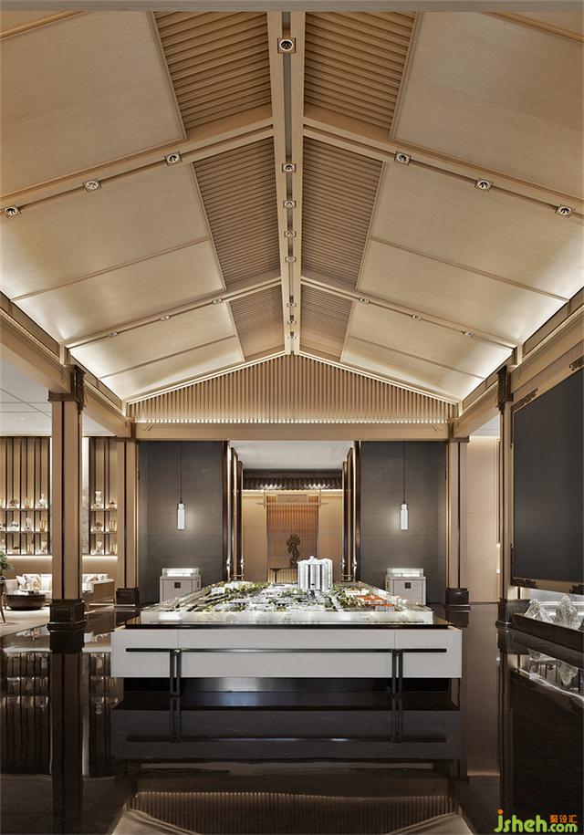 沙盤區(qū)上方采用中國(guó)傳統(tǒng)的坡屋頂元素,用現(xiàn)代手法進(jìn)行重構(gòu),營(yíng)銷中心設(shè)計(jì)展現(xiàn)了傳統(tǒng)與現(xiàn)代設(shè)計(jì)的共鳴,創(chuàng)造出一種包含著能量的“場(chǎng)域”。