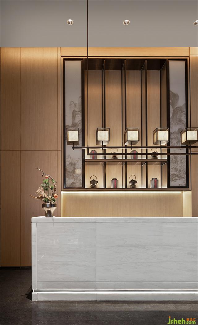 水吧區(qū)在極簡(jiǎn)的乳白色大理石臺(tái)面融入了別具一格的中式陳設(shè)美學(xué),使空間彌漫著簡(jiǎn)雅氛圍。