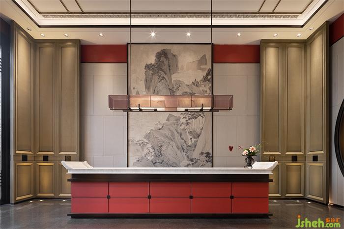 接待前廳,呈現(xiàn)眼前的是明代畫家仇英創(chuàng)作的一幅絹本設(shè)色畫《桃源仙境圖》,營銷中心設(shè)計在朱紅色的風(fēng)致里,一展其獨有的方正拙實之美,于水墨之意的映襯下,詮釋人文·自然·東方的美學(xué)意境。
