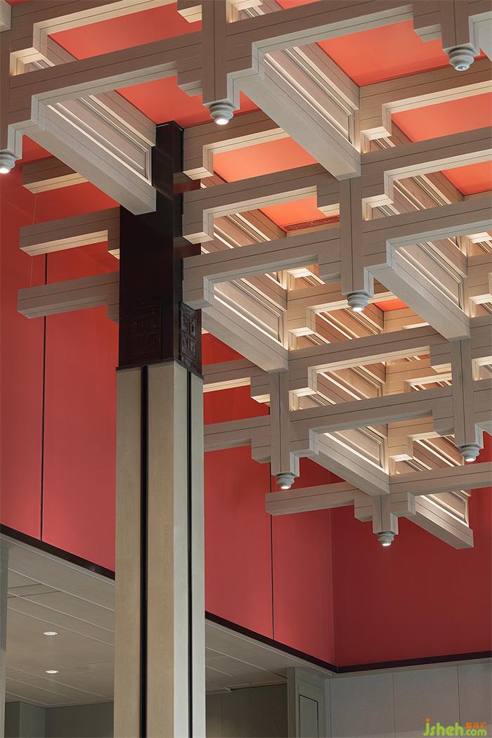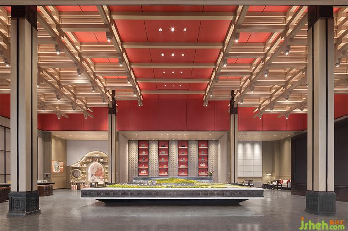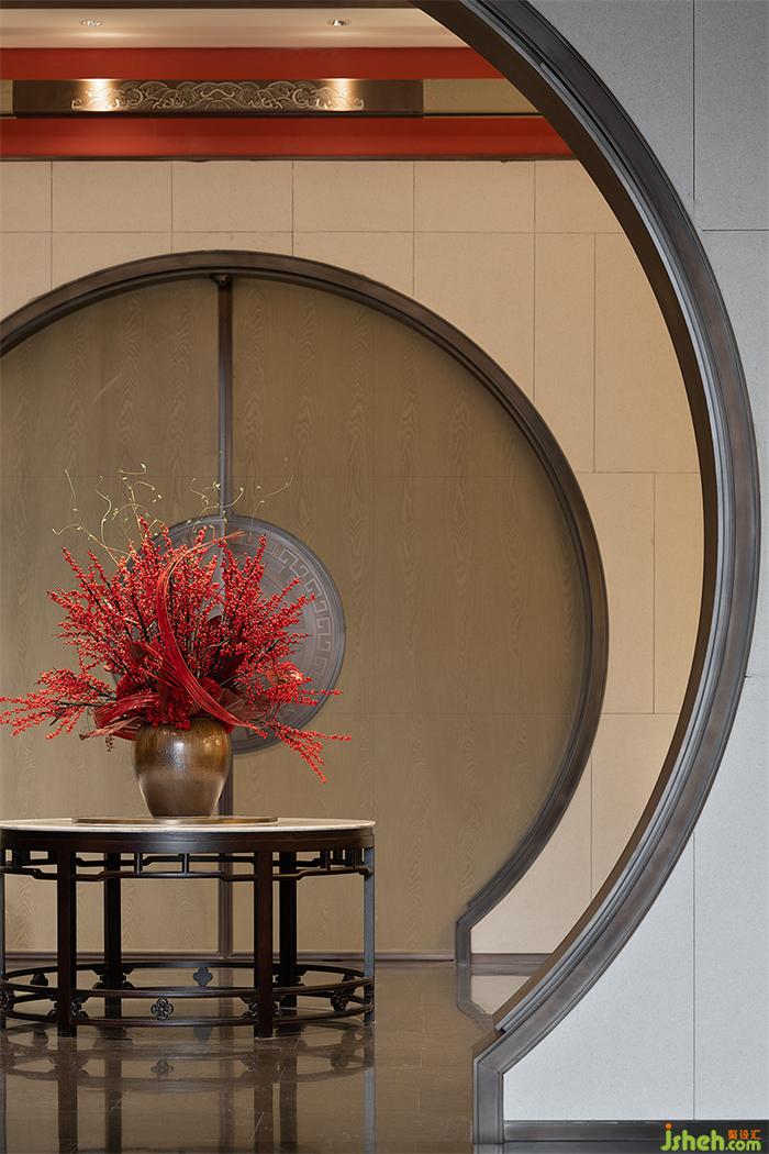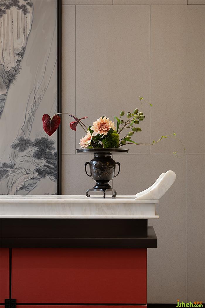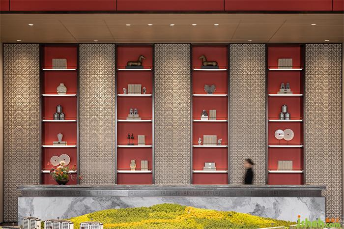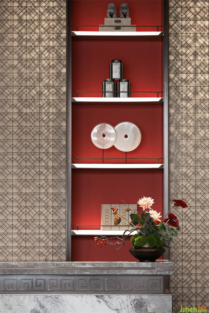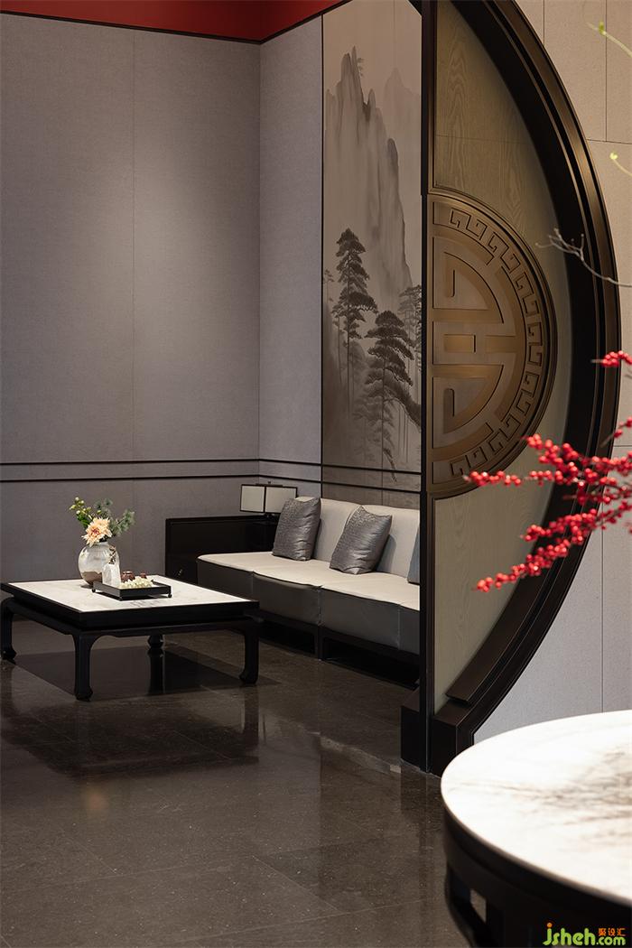 水吧臺延續(xù)了東方的禮序之美,通過傳統(tǒng)的金屬花格概括提煉的方式增強(qiáng)空間形式感,營銷中心設(shè)計點綴中式工藝精湛的瓷器、漆器,以及花藝等軟裝藝術(shù)品,讓空間氤氳著人文雅致。