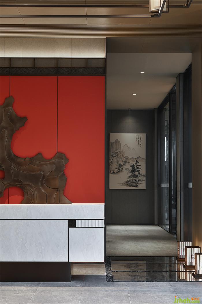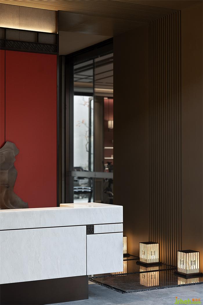 洽談區(qū)的布局一分為二,隔而不斷,局部采用紅色點綴激發(fā)活力,其格調古樸高雅。營銷中心設計臨窗而設的區(qū)域打通室內與戶外景致的視覺聯(lián)結使之更加開敞。露臺區(qū)域弱化了區(qū)域間的邊界又保留獨立性,構建整體空間疏密有致而又相互滲透。和煦日光,將清幽寫意娓娓道來。