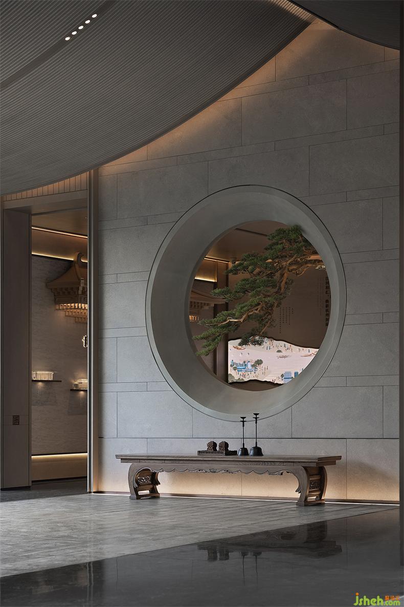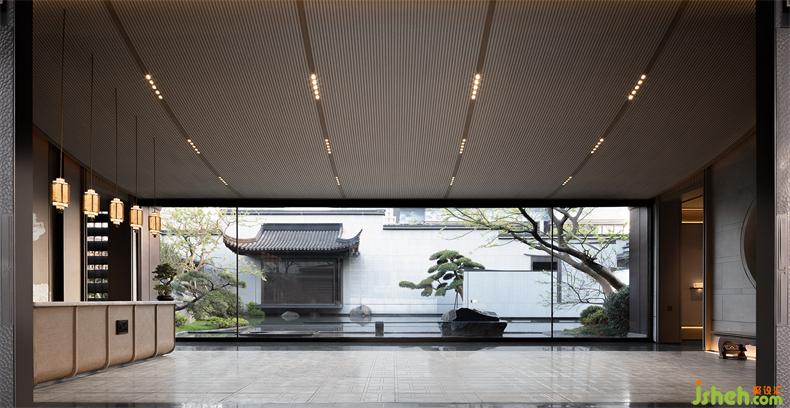前臺(tái)一側(cè),會(huì)所設(shè)計(jì)以虛實(shí)結(jié)合的手法營造一個(gè)半圍合的空間,一方池水,鏡面澄澈,一枝松枝橫斜,樹影婆娑,一池一樹一景,二維畫卷與三維微觀園林水景互為映照,形構(gòu)出靜謐空間氣質(zhì)。