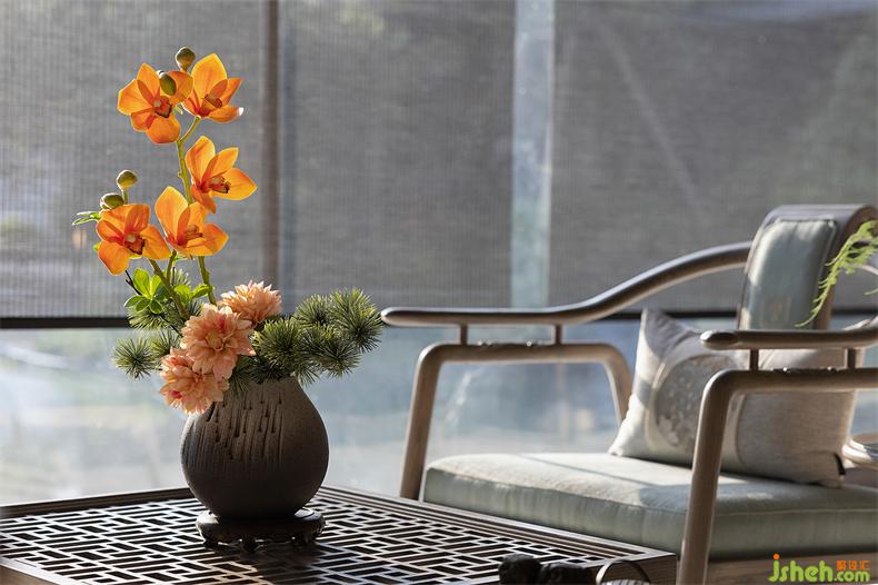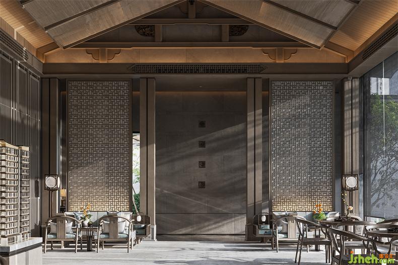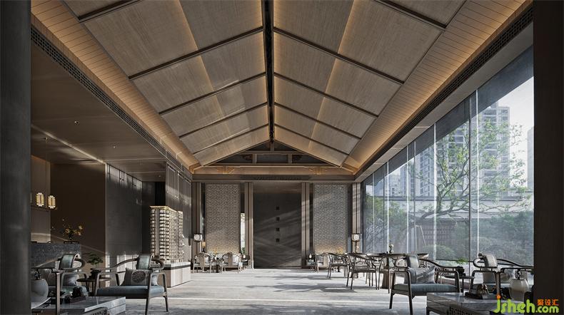 洽談區(qū)的設(shè)計(jì)延續(xù)了東方的禮序之美,對(duì)稱布局,一面是開(kāi)闊的園林叢林景色,一面是豐沛的情境體驗(yàn),共生平衡與和諧。會(huì)所設(shè)計(jì)天花以徽派傳統(tǒng)建筑結(jié)構(gòu)為原型,令空間多了些山峰傲骨的巍然氣韻。