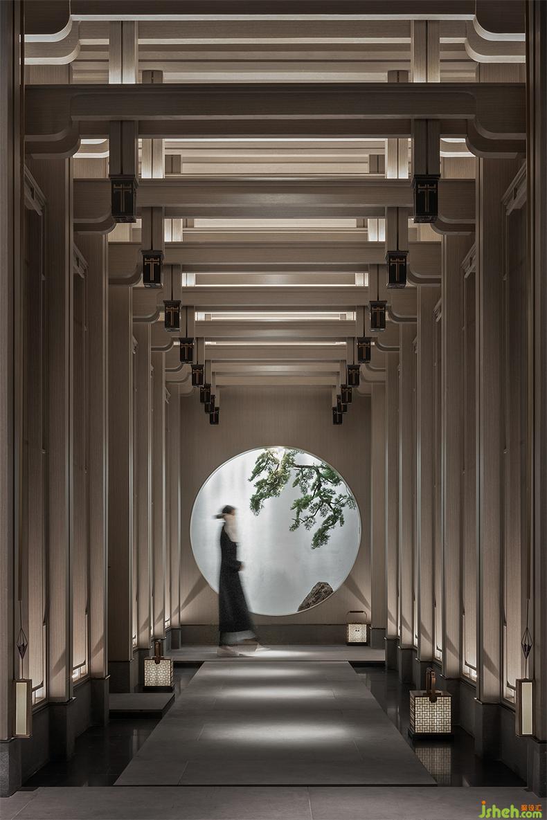長廊中的天花由中國傳統(tǒng)院落得到靈感和啟發(fā),會所設(shè)計隱含了北京的四合院和徽派建筑的結(jié)構(gòu)布局。兩側(cè)引水景穿插,中式方形燈籠飾于長廊之內(nèi),一道云紋的石橋序列其中。整體以含蓄的現(xiàn)代方式詮釋東方意境,陳設(shè)置景,簡凝詩意。