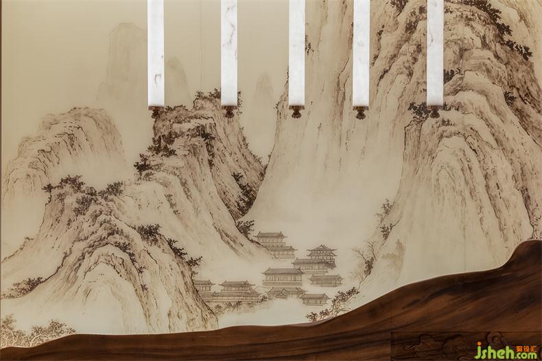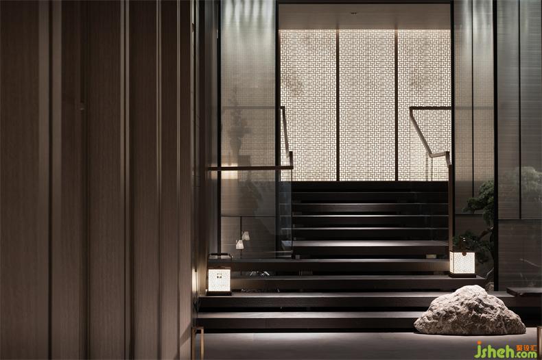 步入地下會所前廳,以臺階形態(tài)為媒介,結(jié)合空間框架及功能進(jìn)行設(shè)計,會所設(shè)計用簡潔的體塊貫穿延伸于整個空間。樓梯兩側(cè)是由水紋燈與夾絲玻璃構(gòu)成的山間清泉流水畫境,用非水之水,作微波水漾,在光線下更顯動人靈光。萬字紋下的格柵屏風(fēng)滲透出影綽的竹林清風(fēng),透光幽靜,增添不同層次的感官體驗。