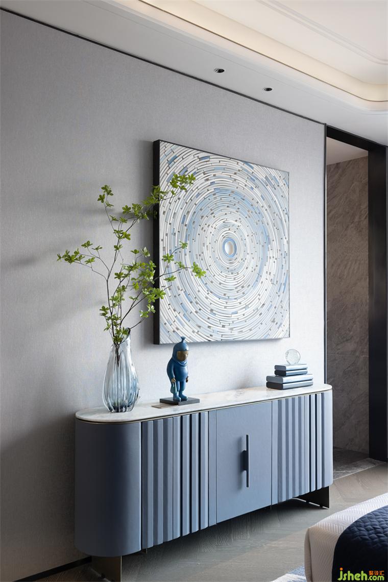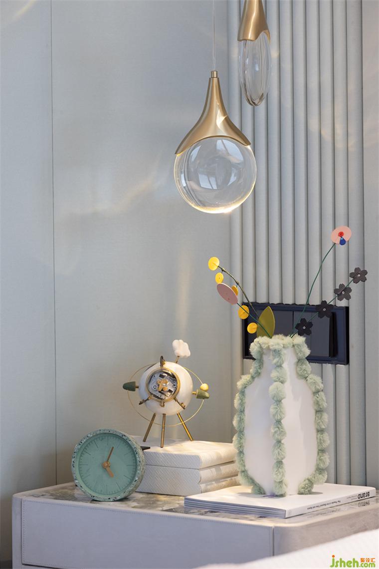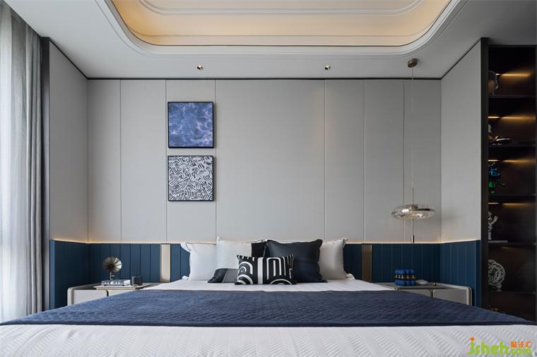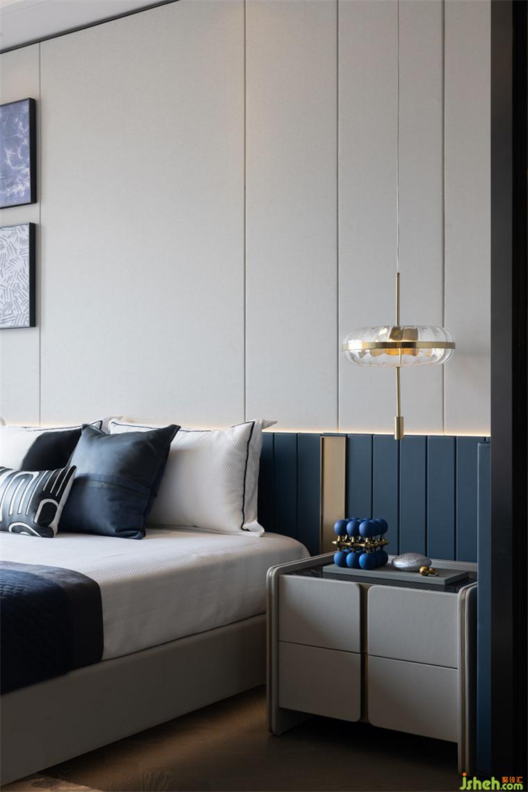 男孩臥室以深邃的藍色調(diào)與灰白空間巧妙貫穿結(jié)合,樣板房設(shè)計凈、簡、素的設(shè)計與自然的活力生機相伴。拉伸了各處層次于細節(jié),給小朋友更多生動未來。