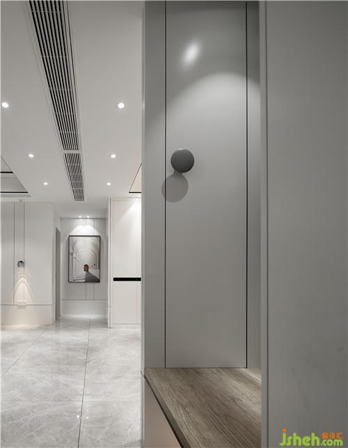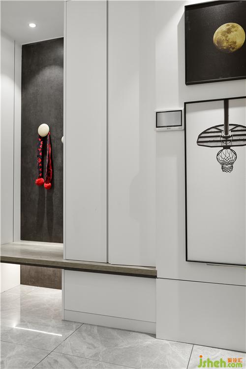 中央空調設計在入戶玄關上面,讓業(yè)主一回到家就可以感受到家的溫度。玄關處設計了鞋柜和隔板,隔板既可以當穿鞋凳,平時回到家,手上提的東西或者包包也可以放在上面。室內設計師