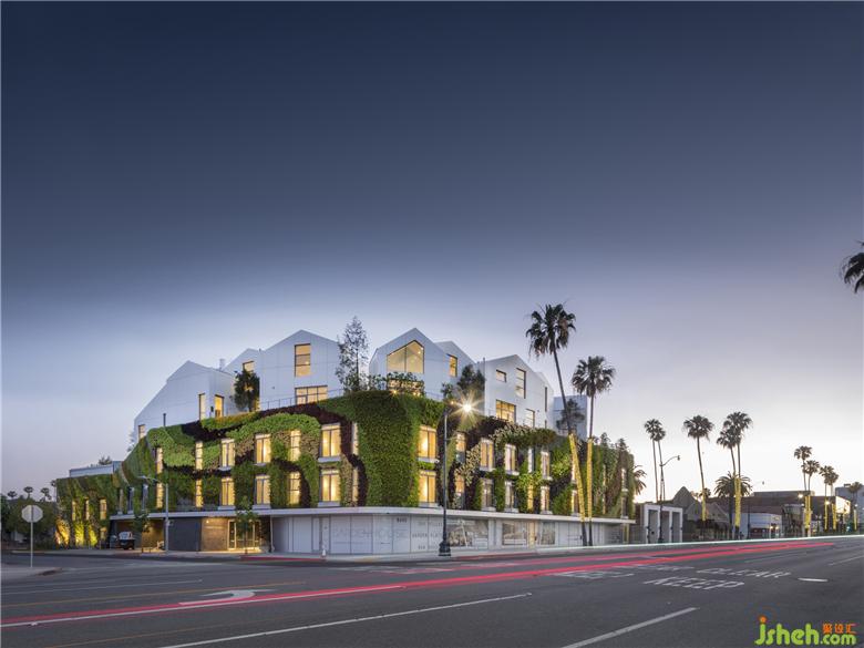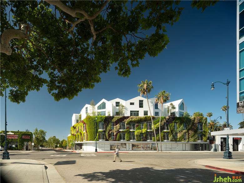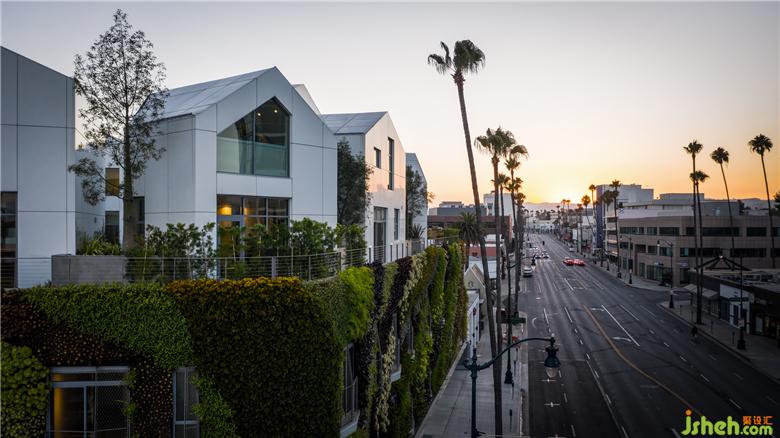 建筑的立面被蔥蔥綠植覆蓋。在常年干旱的南加州,選擇如仙人掌、多肉、藤蔓等本地耐旱植物,適應(yīng)當(dāng)?shù)貧夂颍瑹o需過多澆灌和維護(hù)即可蓬勃生長。植物本身形成建筑立面獨(dú)一無二的肌理,在比弗利山市規(guī)范、整潔、一絲不茍的社區(qū)環(huán)境注入有機(jī)自然,顯得清涼且親和。項(xiàng)目建成后,即成為了美國境內(nèi)面積最大的綠植外墻。