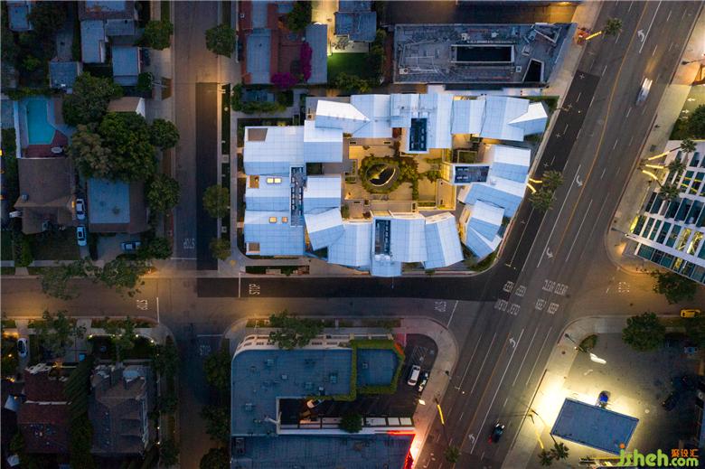“山丘庭院”是一個(gè)混合功能項(xiàng)目:一層是臨街商業(yè),18個(gè)公寓單元此起彼伏生長于綠色平臺之上。層疊的白色立面、尖屋頂,和不規(guī)則的窗試圖在用交錯(cuò)的直線條描繪出動(dòng)態(tài)的畫面。將洛杉磯標(biāo)志性的山莊,在城市環(huán)境中復(fù)制,再在“山坡”上建立小村莊。這個(gè)畫面就像卡通一樣的直接和天真,甚至有些幽默。會(huì)所設(shè)計(jì)