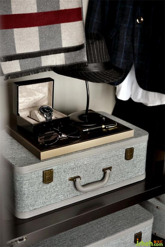 深圳崗宏融湖居精裝提升樣板房設(shè)計師為主臥選用了半藏半開放的玻璃式衣柜,煙灰色玻璃材質(zhì)的柜面增加了柜體的檔次,隱約中可見衣物與珍品羅列,增加收納儀式感與尊貴感,強調(diào)收納儲物功能之外,提升主臥空間氣質(zhì)。