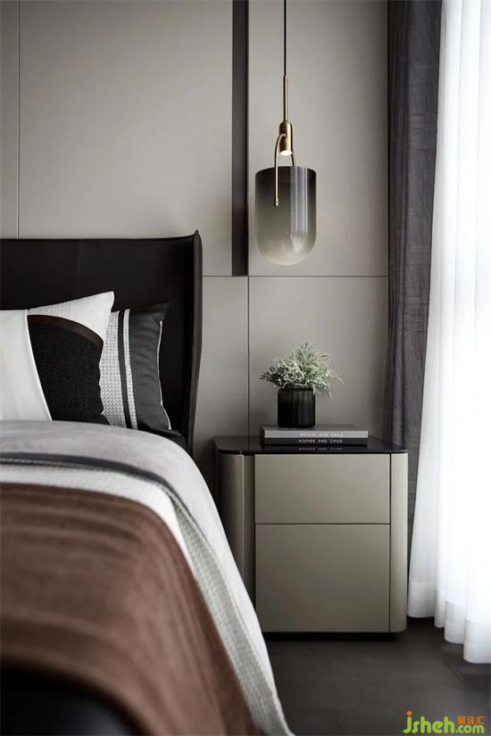 設(shè)計師在每件家具的選用上均遵從簡約品質(zhì)的宗旨,對空間品質(zhì)的要求嚴格把控。主臥的家具不多,自然需要精心挑選一番。床頭柜選用簡約橫豎線條柜面款式,與床頭線性墻面呼應(yīng),床頭燈打破常規(guī)處理,選用半罩體垂吊款式,黃銅色燈桿垂直而下,溫馨的燈光亮起,床頭區(qū)域自成優(yōu)雅一隅。