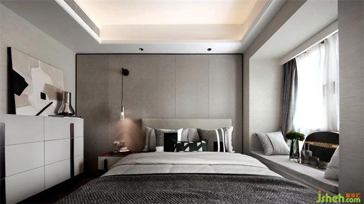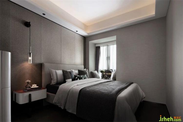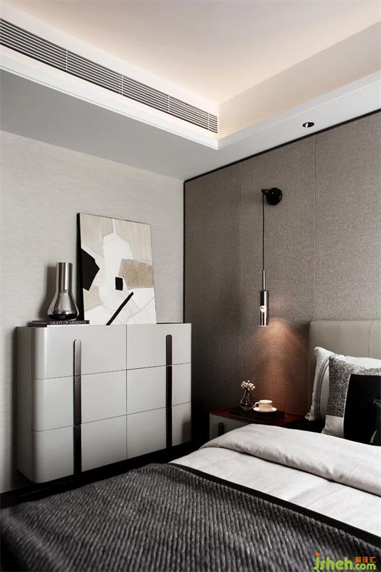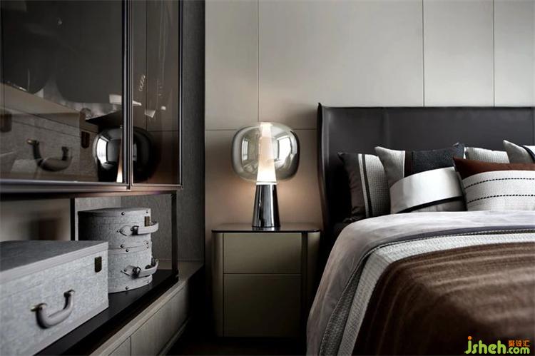 床頭柜的一抹幽幽橙光,中和了整體的灰色調(diào),提亮了整個空間,深圳崗宏融湖居精裝提升樣板房設(shè)計營造出別致的高級感與靜謐氛圍,柔和的光從上方的吊燈傾瀉而來,浪漫的氣息也隨之彌漫到房間各處。