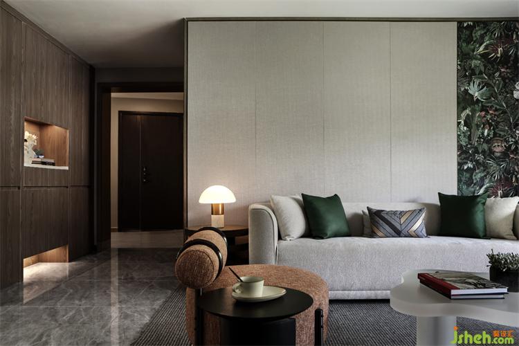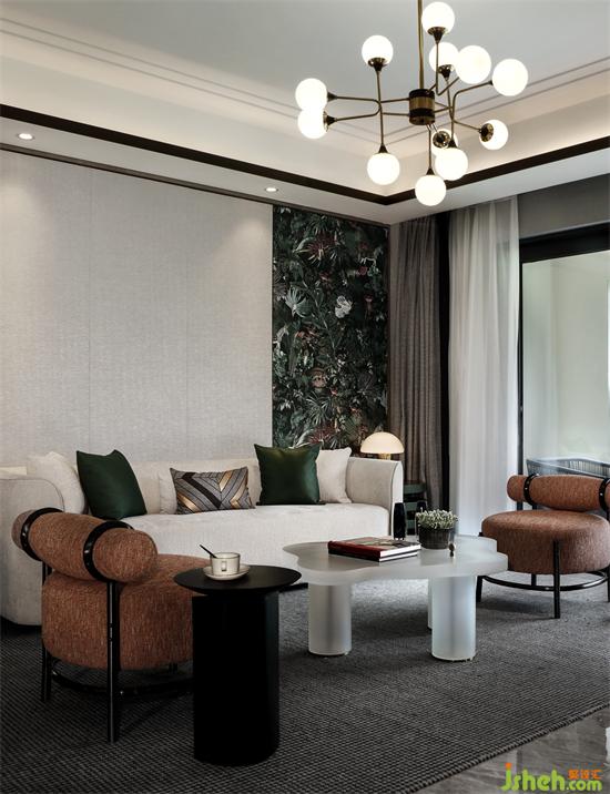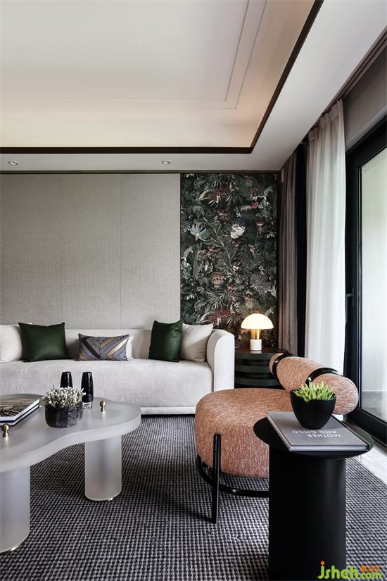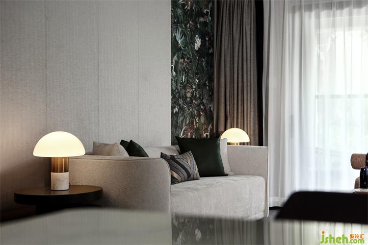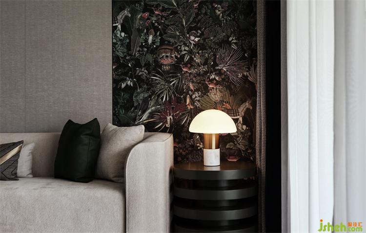 廣州亞運城精裝樣板房設計沙發(fā)背景墻紙選用arte與moooi聯(lián)合創(chuàng)作的主題墻紙,郁郁蔥蔥的植被,栩栩如生的動物,在燈飾的映照下,讓人仿佛身處奇妙叢林,微風輕拂紗簾,攜光線到訪,動靜之間,自然意趣悄然而生。