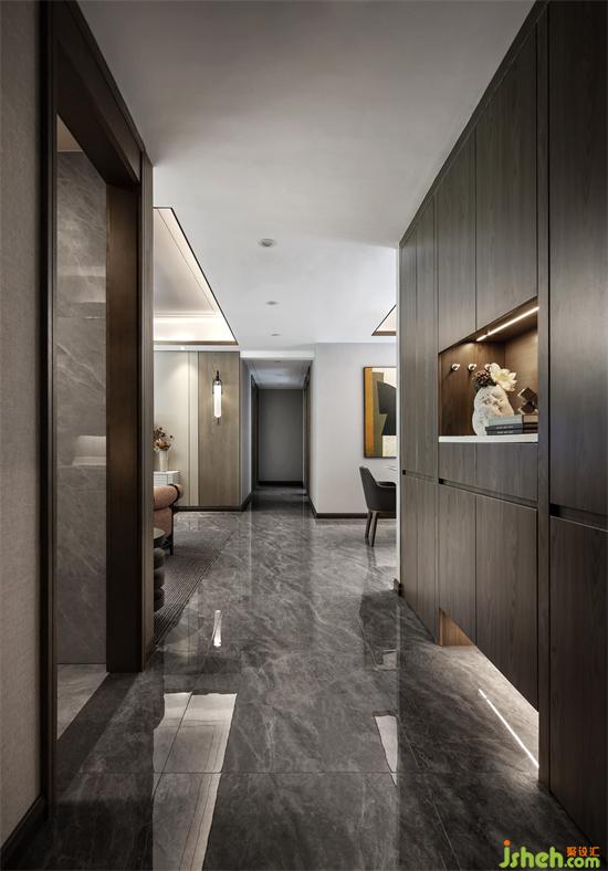入戶的超大玄關柜,超強的收納功能除了存放日?,嵥椋材茉跉w家的第一時間輕松卸下一身的負重和疲累。玄關地面以大理石瓷磚鋪設,一路延伸至室內(nèi)其它區(qū)域,如同一汪清澈的湖水,將生活的質(zhì)感一一呈現(xiàn),引領人們?nèi)ヌ綄っ篮玫木幼◇w驗。